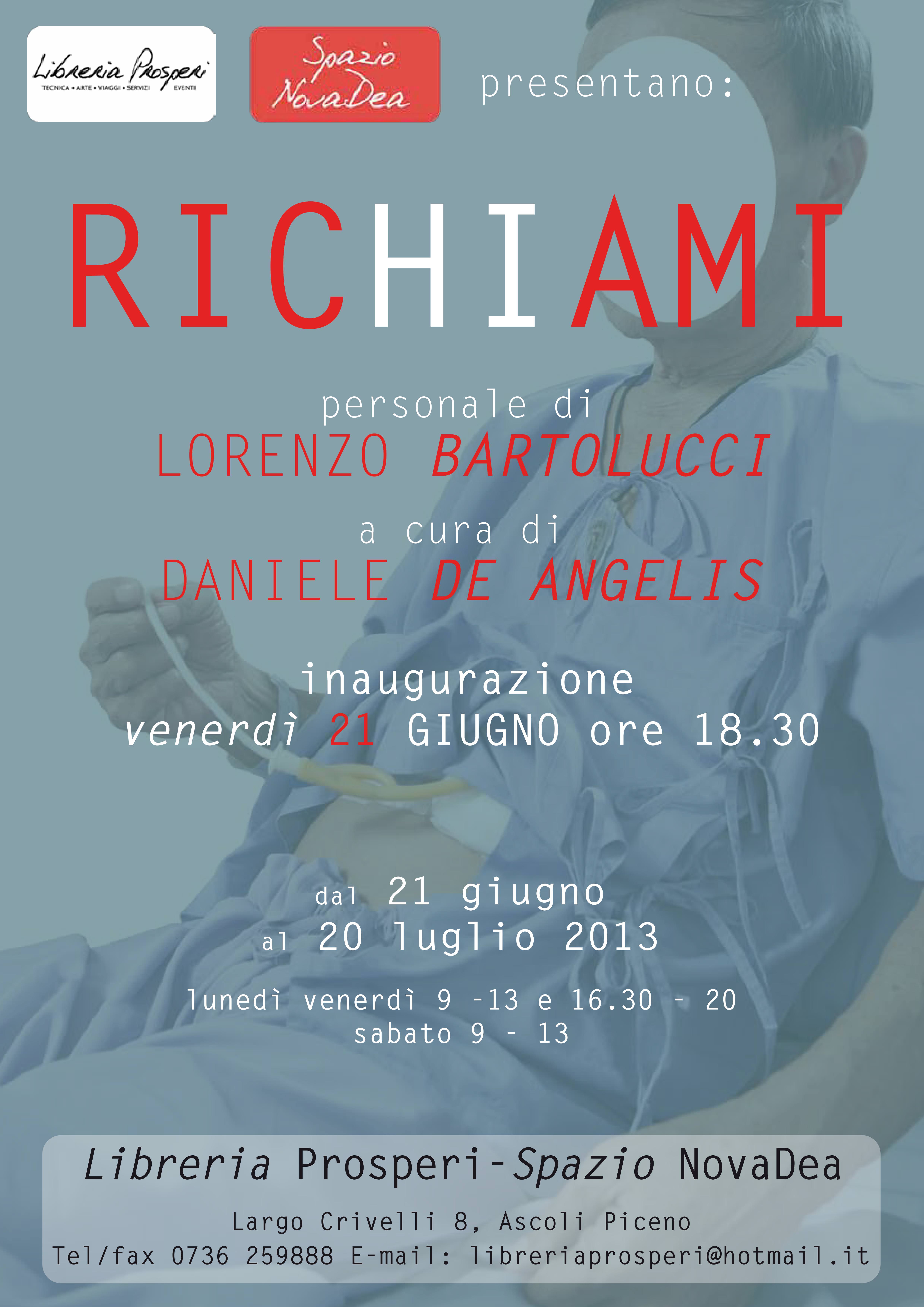 Quarto e ultimo appuntamento espositivo di questa stagione, prima della pausa estiva, allo Spazio NovaDea della Libreria Prosperi di Ascoli Piceno. Dopo le personali di Davide Calvaresi, Ignacio Maria Coccia e An Degrida, venerdì 21 giugno 2013 alle ore 18.30 si inaugurerà la mostra RICHIAMI dell'artista anconetano Lorenzo Bartolucci, a cura di Daniele De Angelis.