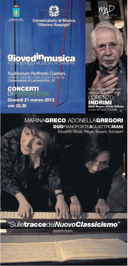 Giovedì 21 marzo alle 20,30 nell’Auditorium Roffredo Caetani del Conservatorio O. Respighi di Latina la Galleria musicale d’arte contemporanea propone l’ultimo appuntamento della prima mostra della rassegna Giovedì in musica, curata da Fabio D’Achille per MAD Museo d’Arte Diffusa, che ha avuto come protagoniste alcune tra le opere più significative del maestro romano Lorenzo Indrimi, ultimo esponente della Scuola Romana.