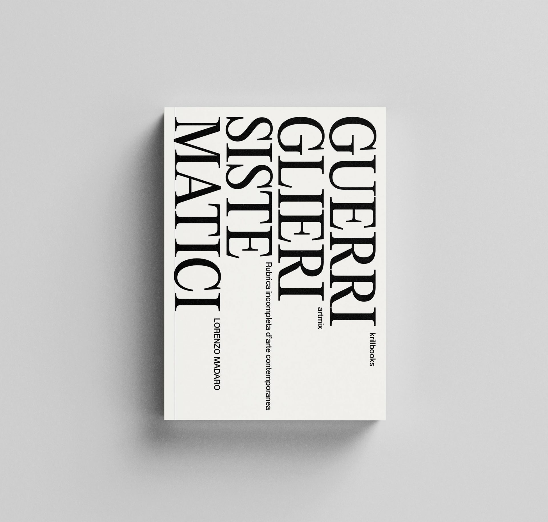 Chi sono, oggi, i guerriglieri nell’arte? Artisti, archivisti, critici militanti, soprattutto quelli meno noti eppure legati alla ricerca o quelli completamente accantonati dal sistema dell’arte dopo anni di azione manifesta. Attraversando le pagine della raccolta di scritti, il lettore potrà trarre le proprie considerazioni su un metodo scientifico quanto militante e su un approccio sistematico verso la scoperta di una dimensione inedita dei presupposti che muovono artisti, curatori, galleristi e professionisti del settore, tra loro distanti per genere o sensibilità eppure, nella visione dell’autore, uniti da profondi intenti etici. Così Lorenzo Madaro si avvicina con disinvoltura sia ad artisti outsider sia a titani del sistema, integrandoli in una visione unitaria e quanto mai democratica, nella quale tutto appare interconnesso. Non c’è un ordine preciso per sfogliare e leggere il libro che è pensato come una rubrica telefonica; a (quasi) ogni lettera corrisponde un nome e un luogo, ma anche un anno. Ci sono dialoghi, testi, affondi in storie e progettualità. Una rubrica aperta, quindi incompleta, aperta alla compilazione. Il libro apre una nuova collana per Krill Books, Artmix, che è un’altra citazione da Celant; il suo paradigmatico libro omonimo del 2008 può rappresentare la sintesi di un approccio realmente plurale in cui, per dirla con il suo pensiero, oggi l’arte si fa con tutto e ovunque senza confini linguistici e territoriali.