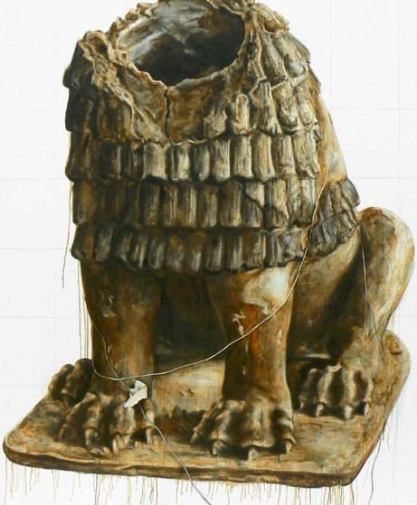 Nel 2008 Lorenzo Manenti ha ideato una installazione a parete di trentadue disegni quadrati 32x32 cm su carta riportati su tela intitolata Iraq perduto. In ciascuno di questi, Lorenzo ha raffigurato un frammento di scultura proveniente dai depositi dell’Iraq Museum di Bagdad e trafugato durante il conflitto del 2003: le mura dei musei non sono bastate a proteggere quelle testimonianze della fertile civiltà nata fra il Tigri e l’Eufrate. Di quei pezzi, non rimane che una banca dati telematica, una fotografia e, talvolta, una sigla di riconoscimento. Per la prima volta, questo complesso era stato presentato in un piccolo spazio espositivo alternativo chiamato “Piscina comunale” in zona Lambrate, a Milano, ma nella sua interezza lo si era potuto vedere soltanto, nell’ottobre 2008, in una mostra a Parigi, Guerre et “paix” a Bagdad, accostato alle ricerche del pittore amerindo Mateo Romero. Il pubblico parigino ne era rimasto molto colpito, definendolo “frappant”. E in effetti, la funzione di questa operazione pittorica era proprio quella di richiamare il fruitore ad una assunzione di responsabilità. Dietro le sembianze delle sculture tramandateci dall’archeologia, infatti, è come se fossero gli uomini di quelle antiche civiltà a risvegliarsi, come se questi volti fossero delle grandi fototessere di uomini di altri tempi, i cui occhi si fissano sul riguardante mostrando, nel frattempo, le proprie generalità (il numero di matricola). Va detto però che, insieme al dispiacere per un patrimonio culturale che si assottiglia, c’è a monte, da parte di Lorenzo, una passione per l’archeologia: già prima di essere letteralmente folgorato dal Medio Oriente, infatti, aveva dedicate delle serie di lavori alla scultura romanica e all’archeologia romana. Rabbia per la devastazione, dunque, ma anche affetto (ma non gusto antiquario) verso l’antico. Bisogna anche sottolineare che, al di là dell’operazione concettuale, il suo è lavoro di pittore, in cui si apprezza soprattutto la fiera e sicura bellezza del segno a carboncino, leggermente sporcato di vernici trasparenti brune, consueta nel suo lavoro recente. Lorenzo, insomma, non si limita a un lavoro di copia, ma risemantizza il soggetto, lo restituisce in uno stile dal tratteggio nervoso e sintetico. Manenti ha scelto la strada della traduzione plastica del soggetto, insistendo soprattutto sull’impatto emotivo dell’immagine, complici le dimensioni considerevoli di buona parte dei suoi lavori. Nelle sue opere, infatti, molti oggetti si trovano ad essere notevolmente aumentati di scala rispetto agli originali, accrescendone senza dubbio l’effetto drammatico. Ma anche su formati più contenuti, come nel composito Iraq perduto, la forza espressiva dell’immagine non ne è diminuita, anzi conserva una intrinseca monumentalità.