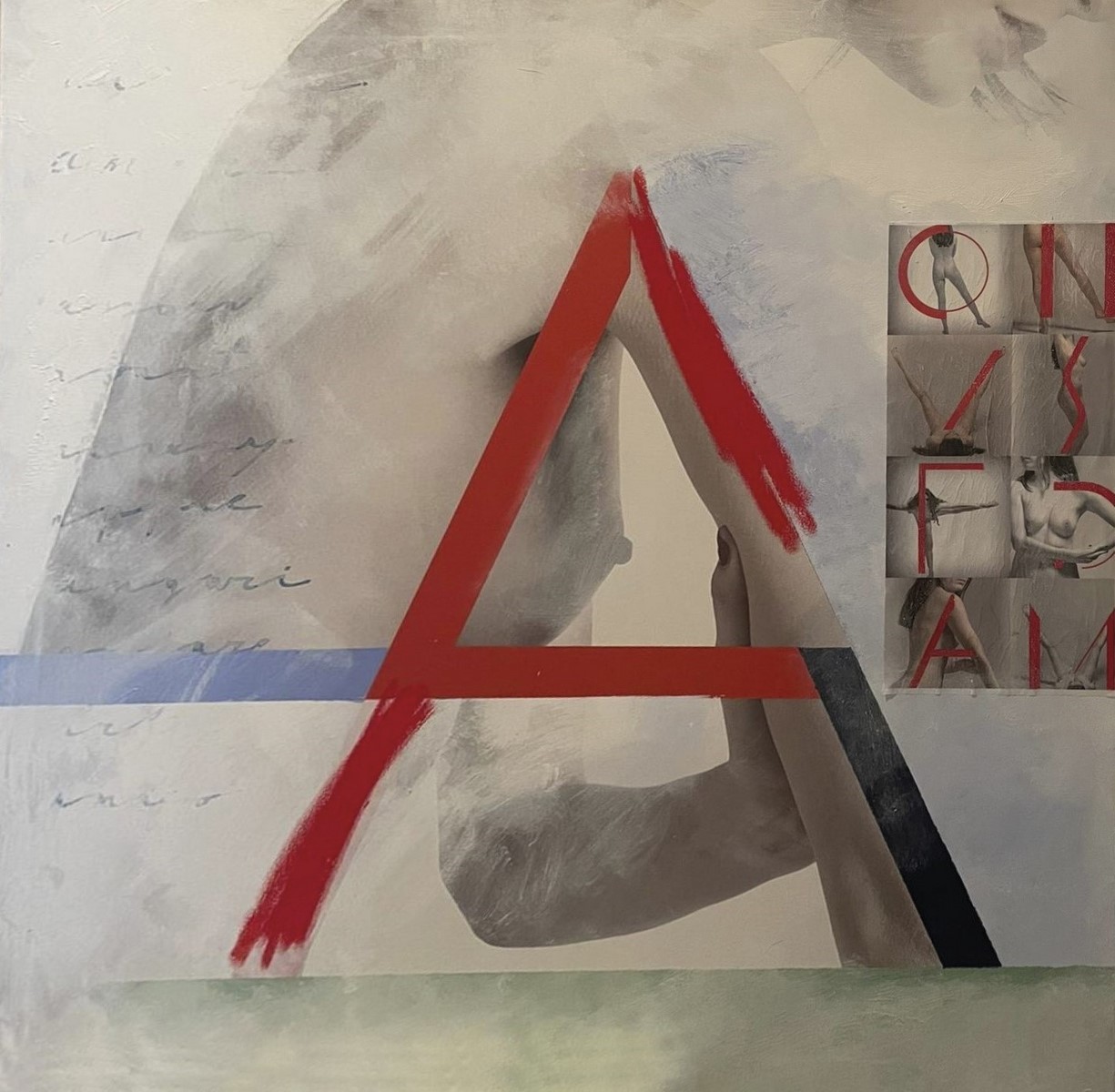 «Suggerire è più interessante che dichiarare», scrive Lorenzo Marini. «La singola lettera o un intero alfabeto è un gioco dialogante tra chi legge e chi compone. Un nascondino parziale, una intimità condivisa, un gesto pittorico per completare il legame con la scrittura calligrafica, dove l’Oriente fa capolino con i suoi ideogrammi secolarizzati. Come i logotipi che circondano la nostra vita, anche questi corpi maschili e femminili diventano lettere-icone, passando dal luogo della lettura a quello della condivisione visiva».