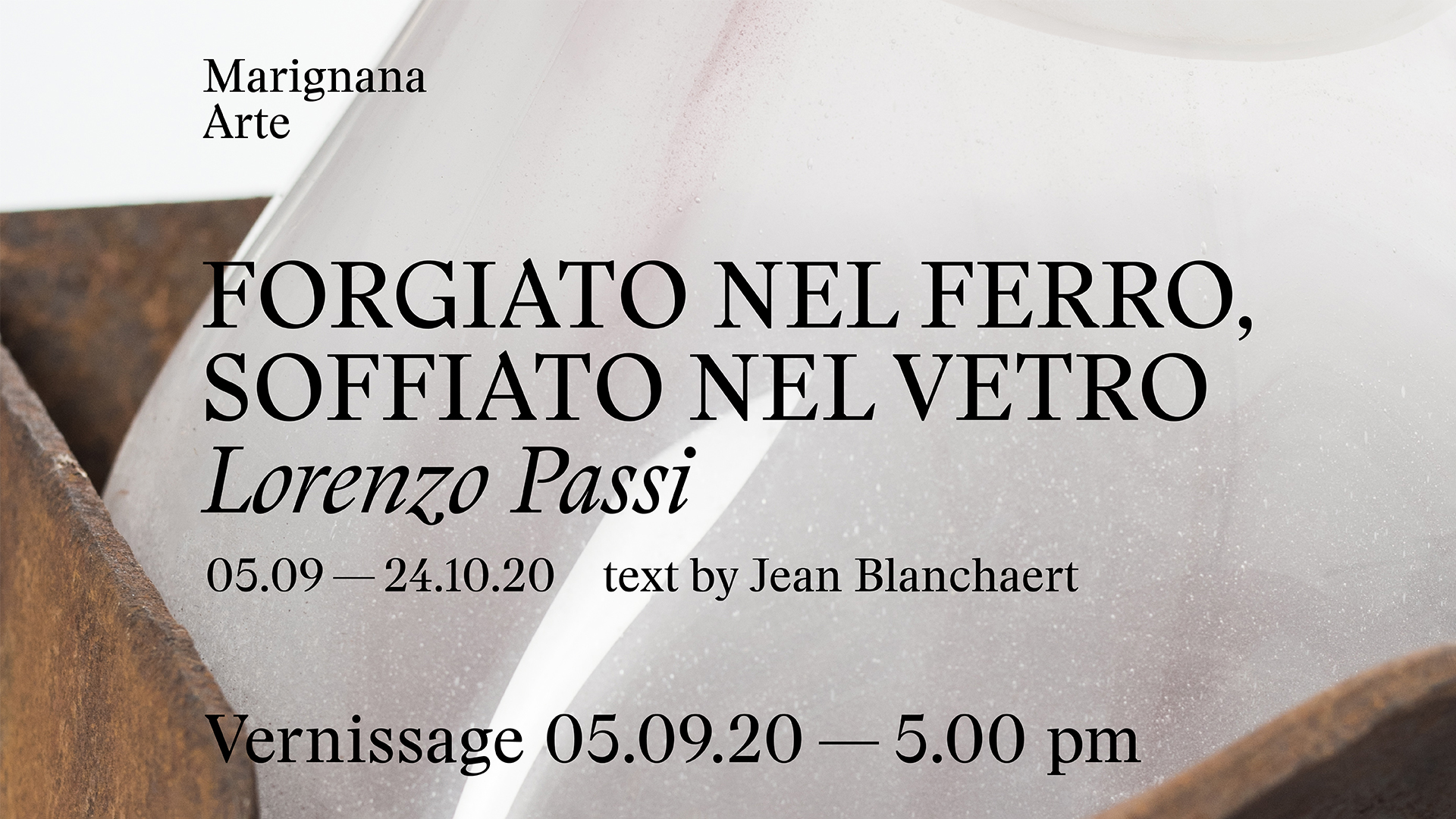La mostra personale di Lorenzo Passi presenta una serie di sculture in vetro e metallo, sintesi perfetta della ricerca dell’artista per cui il vetro atto di soffiare è inteso come flusso di energia vivificatrice che scorre dall’io creatore dell’artista al pezzo che sta realizzando.