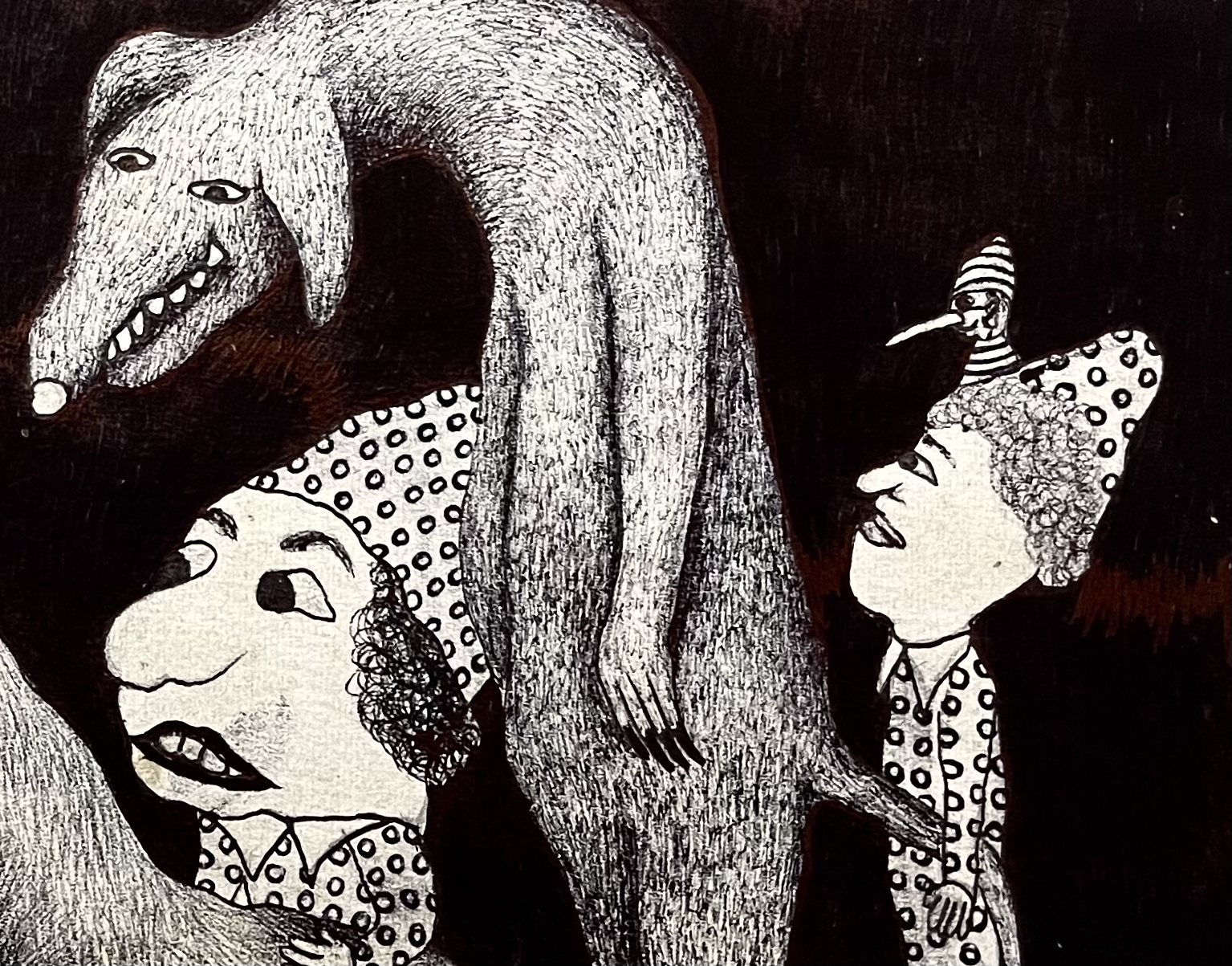 Due dipinti di grandi dimensioni attraversano lo spazio invitando a immergersi nell’immaginario di Lorenzo Testa, un altrove visionario in cui personaggi insoliti popolano ambienti singolari dando vita a comunità immaginate, narrazioni possibili e, probabilmente, Storie infinite.