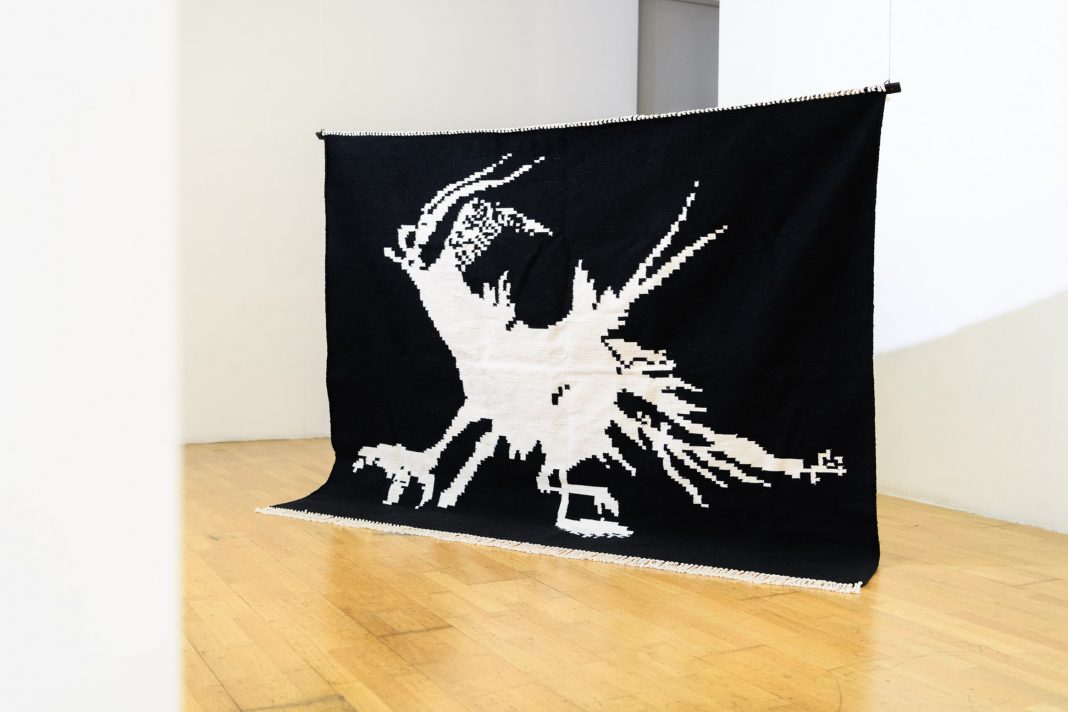 Se il kilim è stato realizzato con tecniche tradizionali, al contrario l’immagine è stata ottenuta rielaborandola digitalmente utilizzando un’estetica da vecchio videogioco.