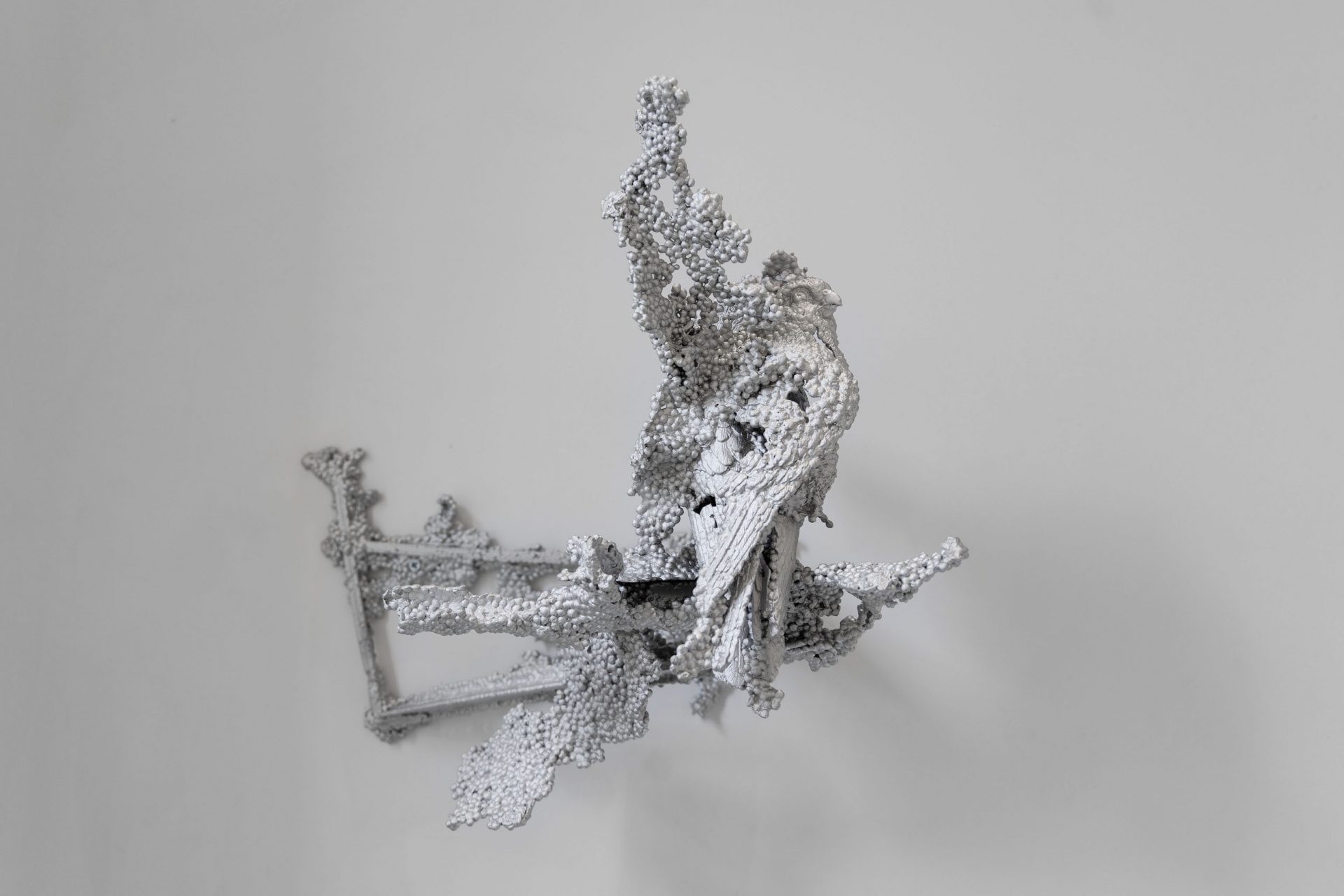 Zigzags particles è una nuova serie di sculture in fusione di alluminio: uccelli posati su piccole strutture, pervasi da una idea di materia in trasformazione. La forma granulare