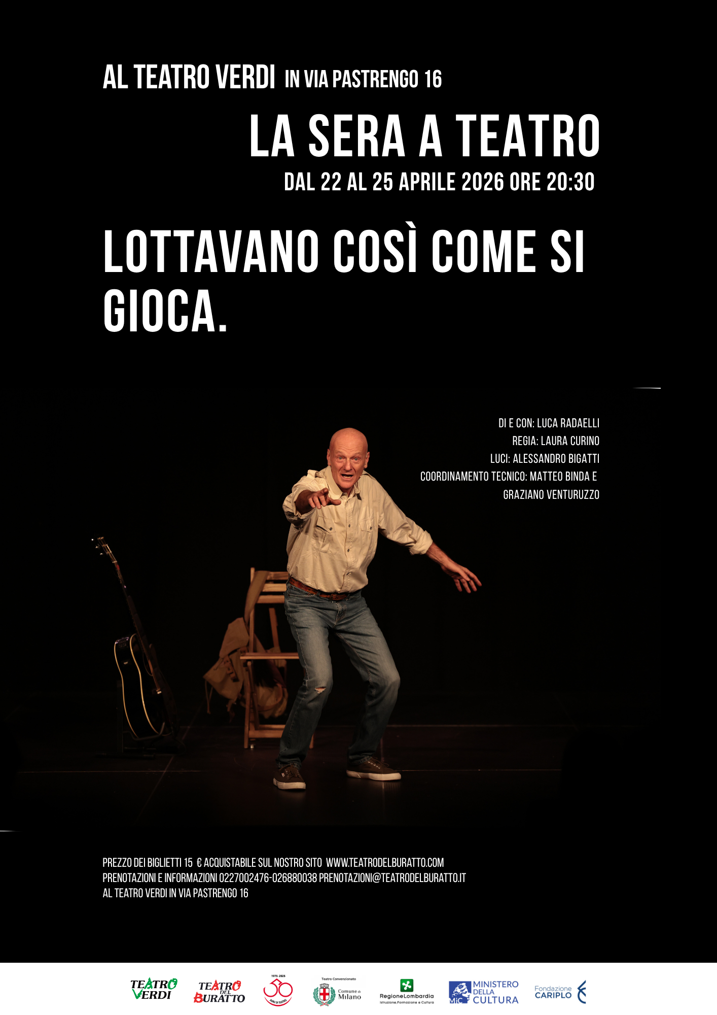 Al Teatro Verdi di Milano va in scena dal 22 al 25 aprile 2026 “Lottavano così come si gioca”, spettacolo di narrazione scritto e interpretato da Luca Radaelli con la regia di Laura Curino. Il 22 aprile alle ore 18.30, presso il bistrot del Teatro, si terrà un incontro con Gianni Barbacetto.