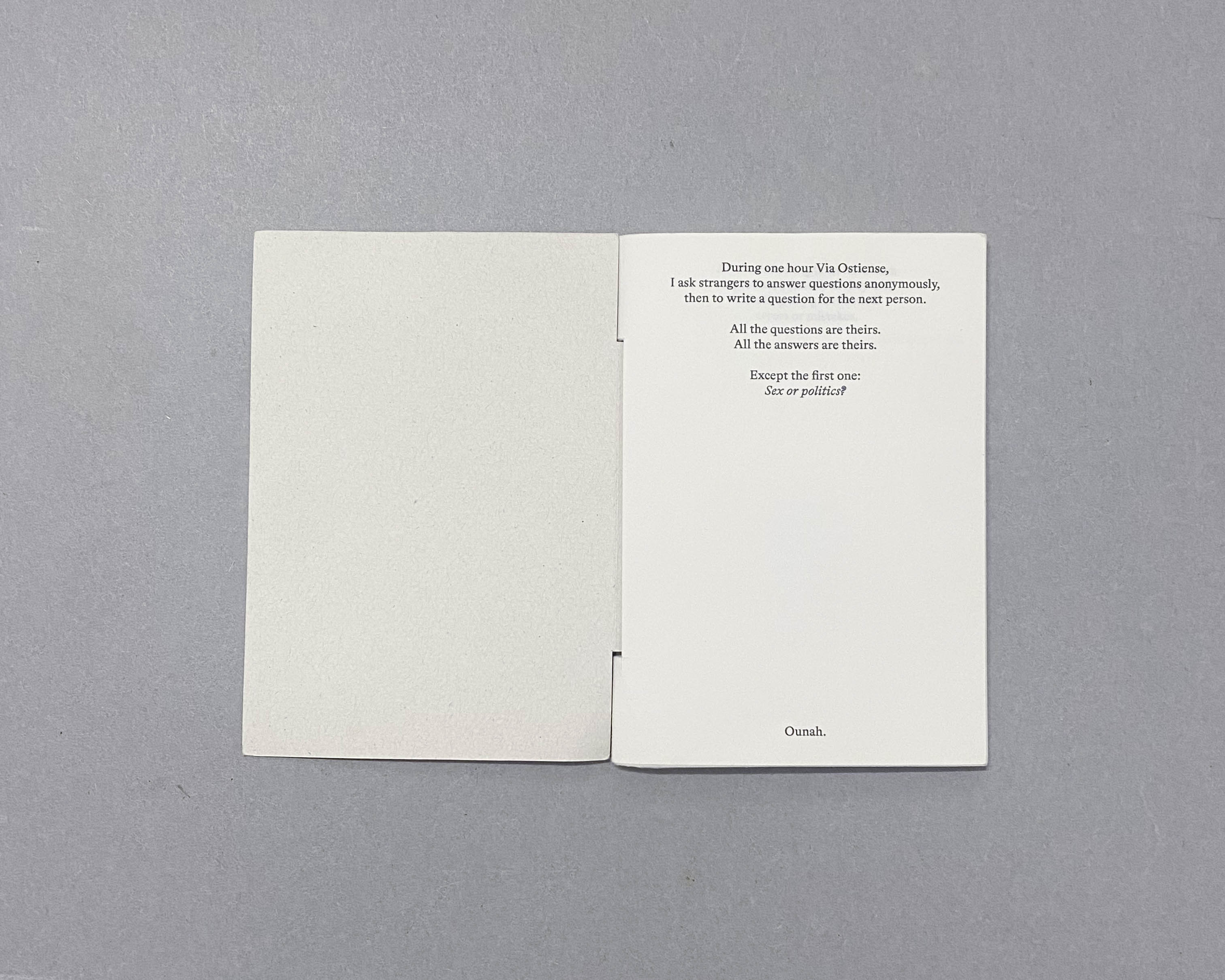 Sex or Politics? è una pubblicazione che nasce da un progetto partecipativo incentrato su una conversazione anonima di un’ora tra sconosciuti a Roma. Il processo coinvolge una persona che pone una domanda, mentre un’altra (a lei sconosciuta) risponde e propone una nuova domanda per qualcun altro. Questa catena prosegue, creando un filo di dialogo spontaneo e non filtrato. La pubblicazione raccoglie questi scambi scritti a mano, preservando l’individualità di ogni partecipante attraverso la propria grafia unica, mantenendo però nascoste le identità. Per celebrare l’uscita della pubblicazione, nel corso della serata si svolgerà una sessione di domande e risposte ispirata al progetto partecipativo alla base dell’opera.