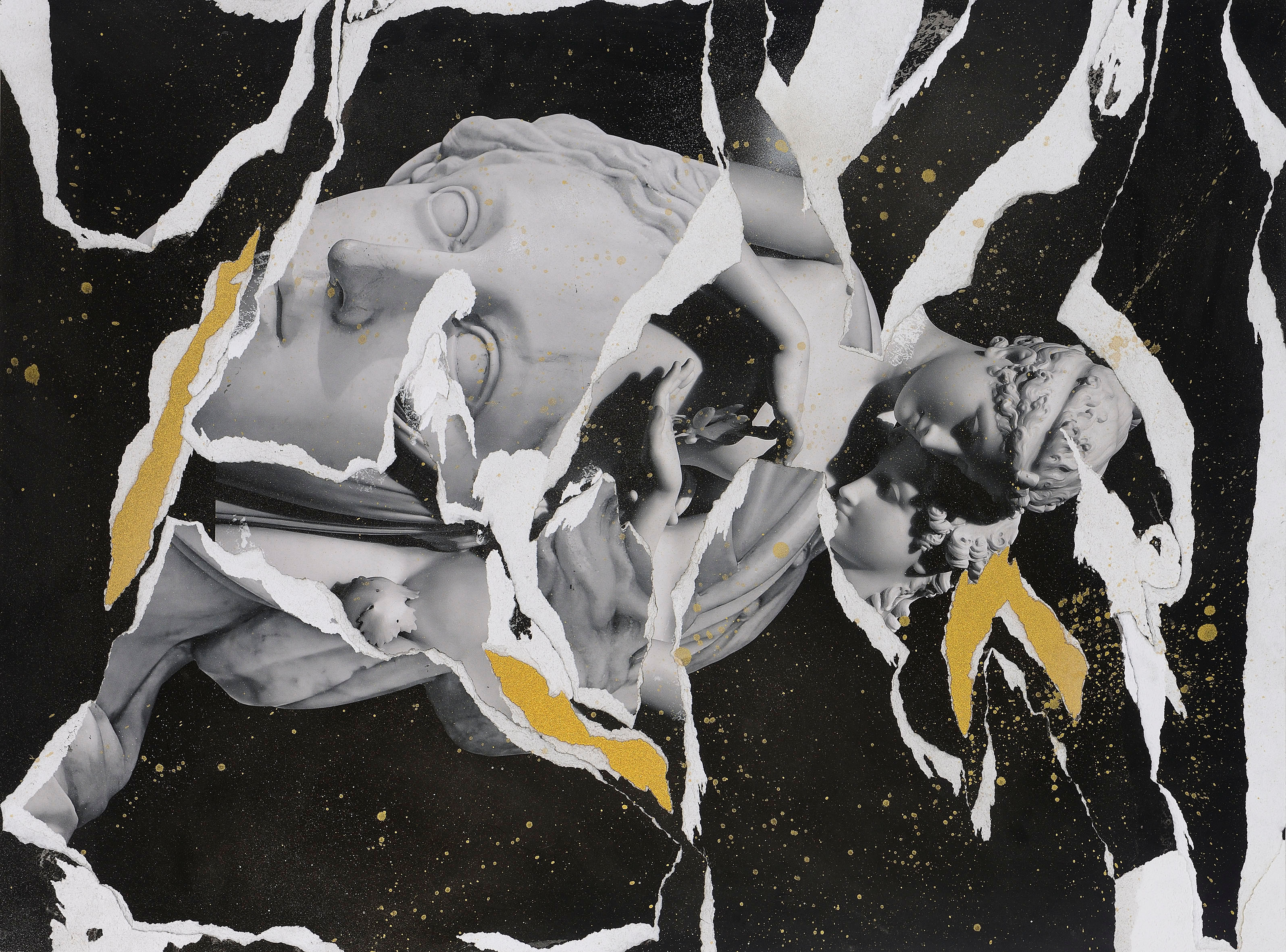 Il “passaggio dalla dissoluzione alla rinascita” delle ataviche origini si riscontra anche nei décollage, i quali, a differenza dei lavori realizzati dai Maestri del Novecento, non raffigurano l’epoca pop contemporanea bensì opere classiche scarnificate della loro Bellezza, ridotte a brandelli come parvenze sognanti di un passato dal quale è ancora possibile carpire universali insegnamenti.