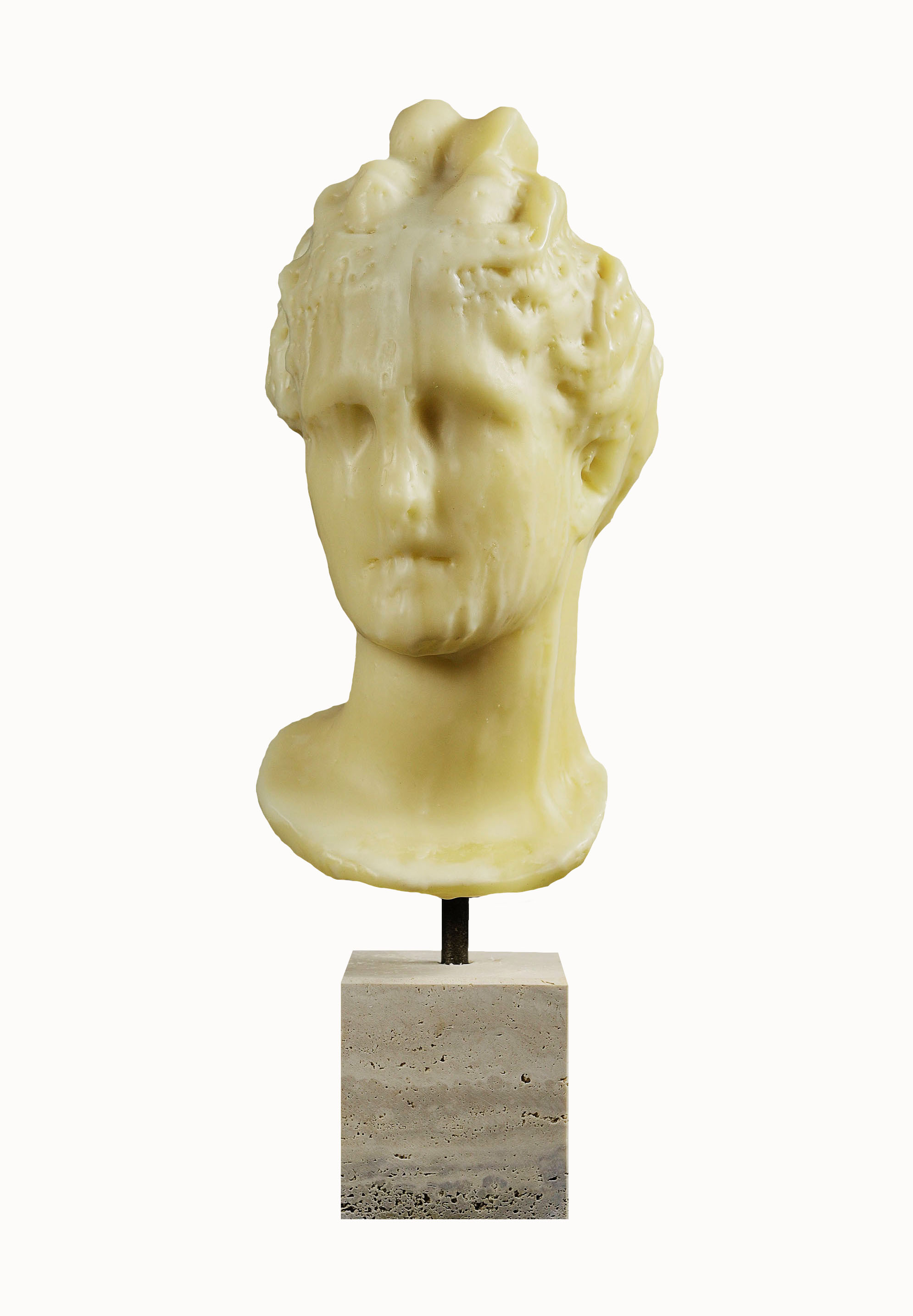 Lou Duca, con il set di opere scelte per questa mostra, omaggia il mondo classico e l’idea del bello da questo proposta; partendo da calchi di statue romane antiche ne costruisce una riproduzione fedele in cera che viene poi aggredita con una fonte di calore e sciogliendosi ne cancella parte della originaria bellezza e perfezione evidenziando quella componente di caducità a cui nessuno può sottrarsi. E risulta singolare che la cera, il cui utilizzo è di solito prodromico per la realizzazione di un’opera, diventi il punto di arrivo della ricerca dell’artista: le colature sui volti o sui corpi ad enfatizzare le fragilità dell’uomo e della bellezza.