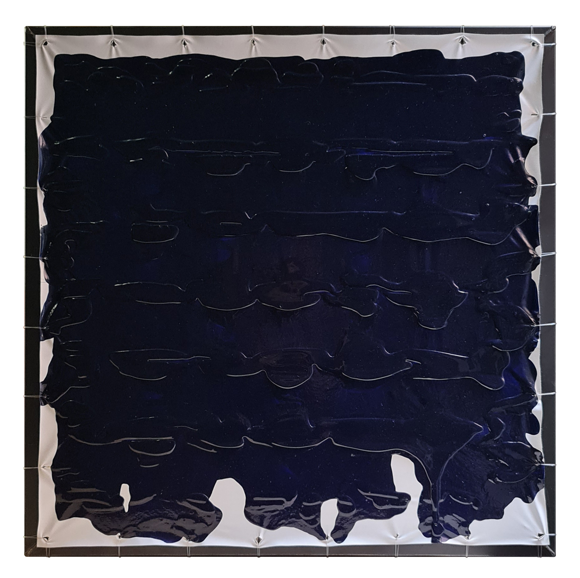 Greta Grillo ci propone una pittura astratta dove è la stessa pittura protagonista del suo divenire e l’artista diventa l’abilitatore del processo che porta alla nascita dell’opera riversando su quadrati di tela bianca plastificata, precedentemente messa in trazione con dei chiodi, barattoli di vernice industriale utilizzata per coprire elementi di arredo esterni. L’aggressività dello smalto da carrozzeria sulla tela di plastica innesca una reazione di fusione chimica che imprime un movimento al flusso del liquido, sarà il tempo a far si che la vernice si asciughi in modo del tutto imprevedibile raggrinzando la plastica sottostante e segnandola con bolle, sacche ed increspature, solo in parte facilitate dall’artista. E’ come se ogni opera, unica, si autoproducesse.
