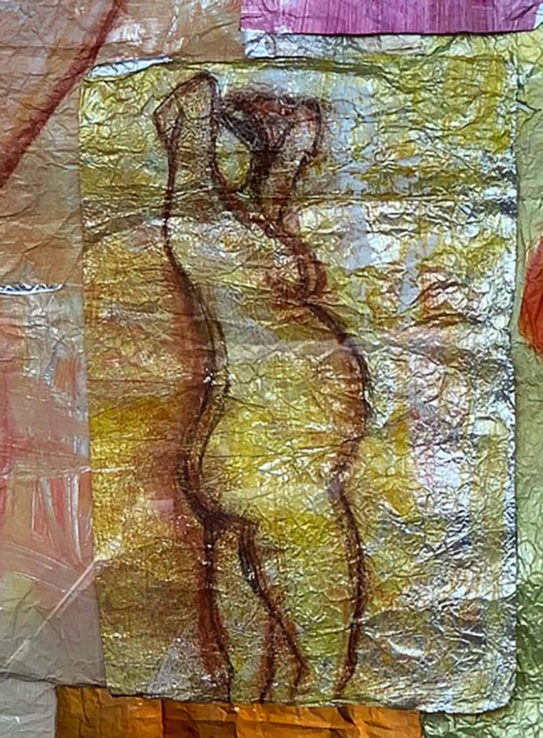 l’artista con le sue figure femminili su carta stagnola realizza un’installazione in forma di “preghiera”, uno spazio sacro e di gioco fatto di elementi colorati e scintillanti che riverberano nel vento, predisponendoci ad accogliere – nonostante tutto – un creativo sentimento di vitalità e speranza