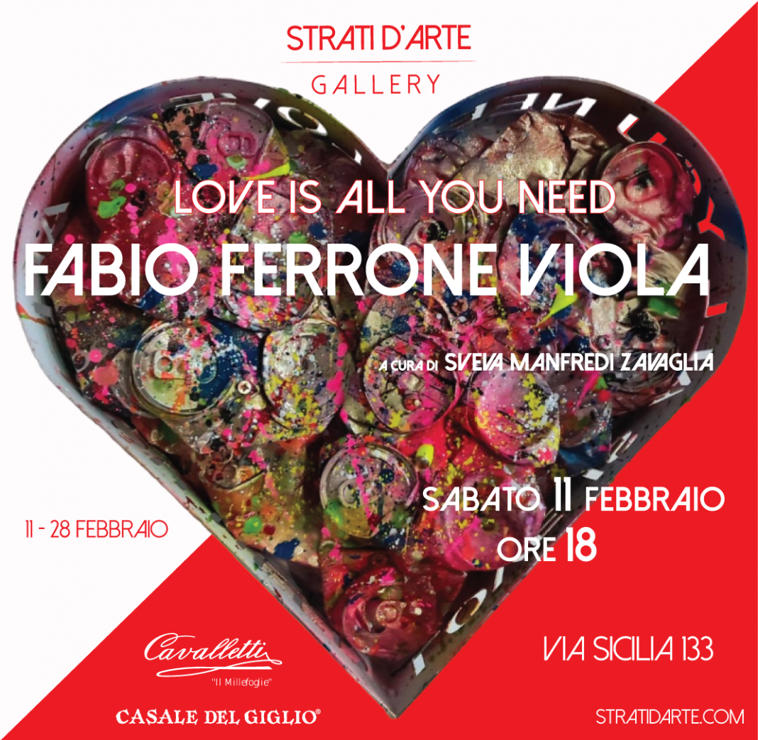 Apre a Roma, Sabato 11 febbraio 2023 alle ore 17.00, presso la Strati d’Arte Gallery, la mostra personale di Fabio Ferrone Viola, artista famoso nel panorama artistico italiano e internazionale, a cura di sveva Manfredi Zavaglia. Finalizza la sua opera all’immanenza, mettendo anima e corpo e creando così una mostra dal titolo: “Love is all you need” parafrasando il famoso testo della canzone di Lennon-McCartney e mettendo in visione la propria genialità contaminata dal mondo che ci circonda.