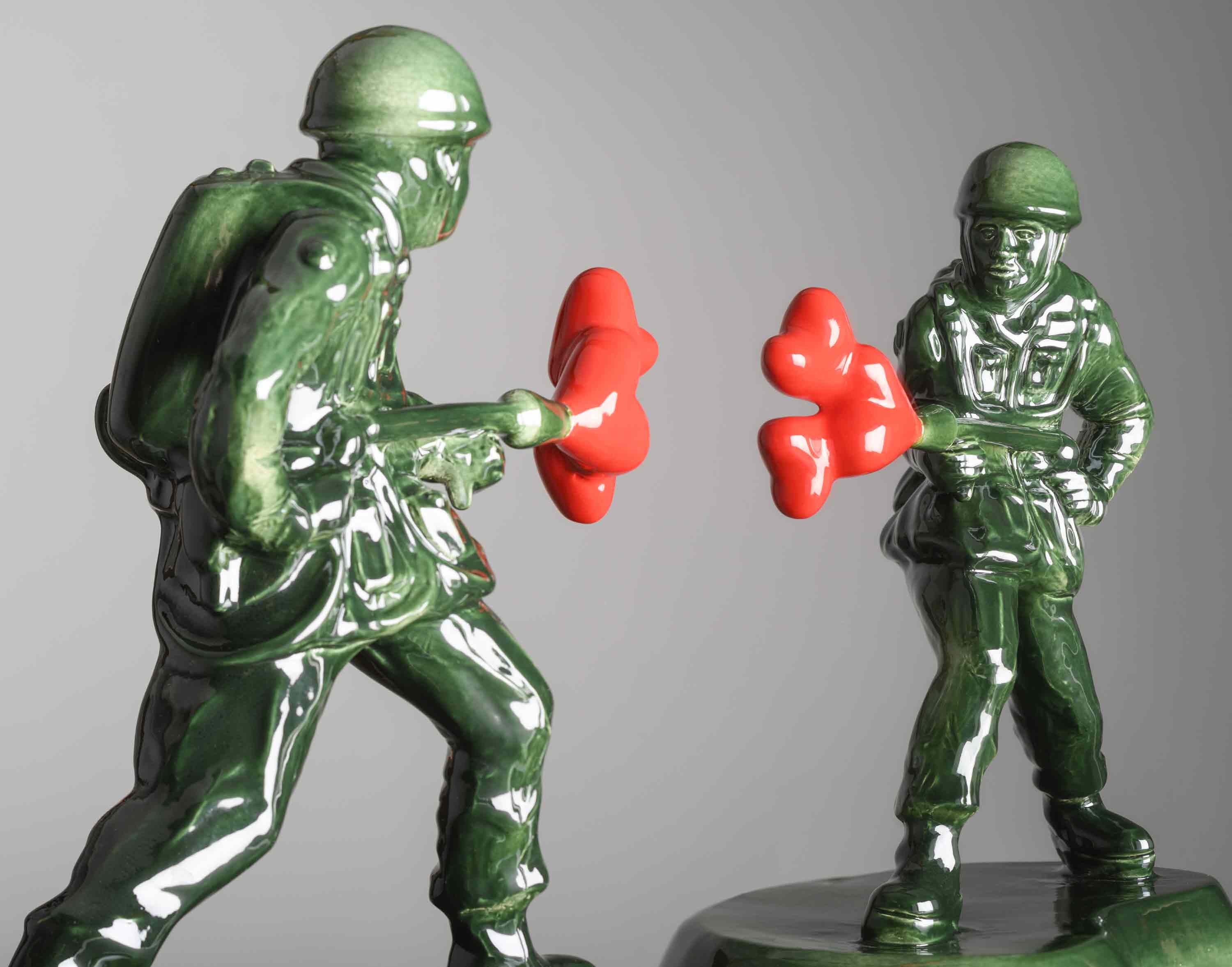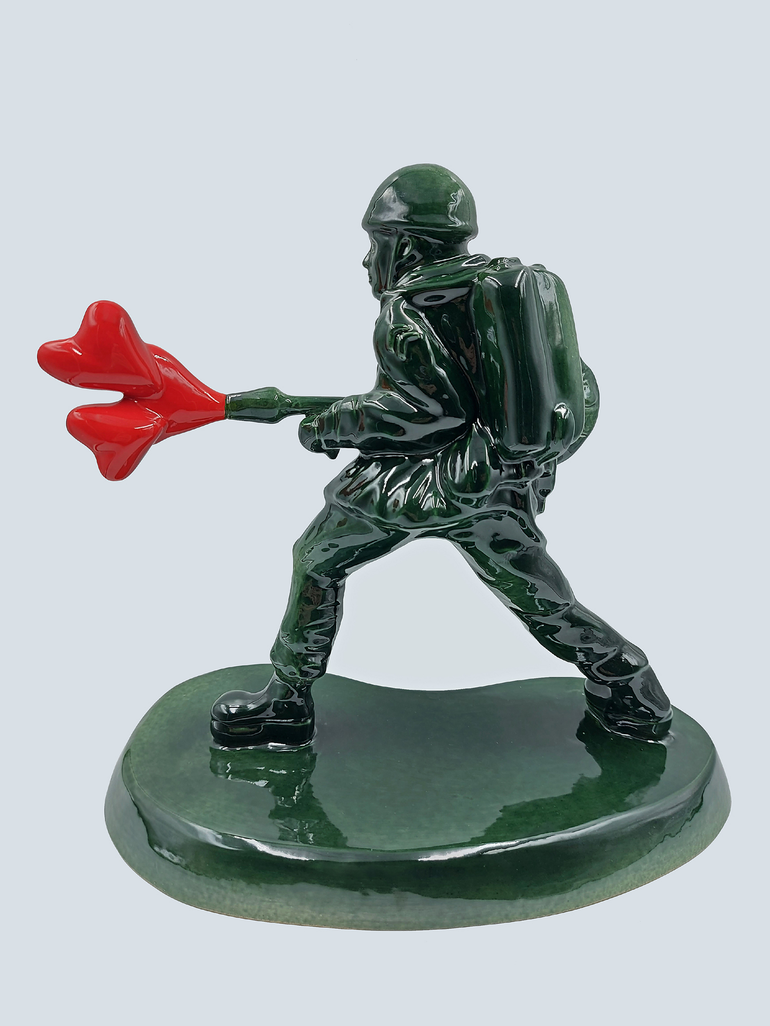 Da qui ha rielaborato i lavori dei writers, riproducendo l’immagine sul muro del soldato che sparava cuori trasformata in un’opera tridimensionale, volendo mantenere forte e chiaro il suo messaggio sociale. Un lanciatore di fiamme che invece di usare la sua arma per scopi bellici sparando un getto infuocato, compie un atto d'amore e di pace sparando cuori.