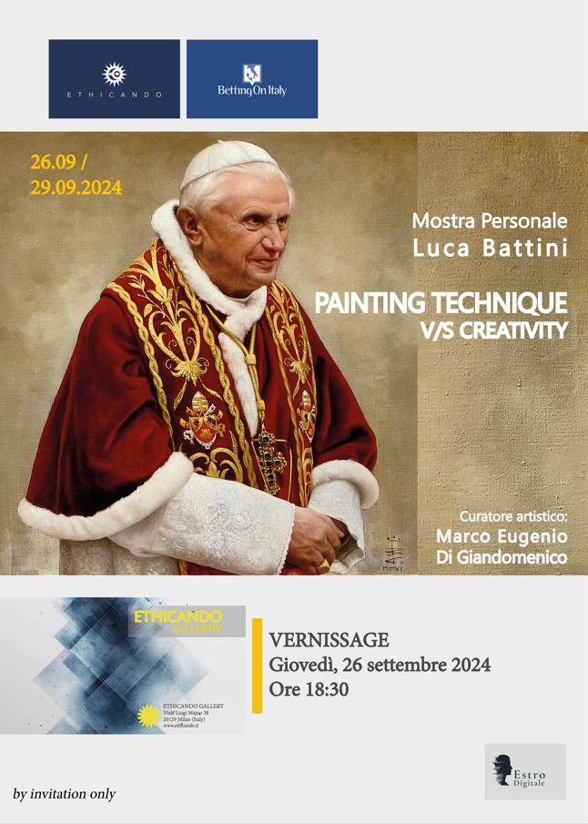 Dal 26 al 29 settembre 2024, ETHICANDO GALLERY, presso la sua sede espositiva di Milano, Viale Luigi Majno n. 38, organizza la mostra personale dell'artista Luca Battini dal titolo PAINTING TECHNIQUE V/S CREATIVITY, con la curatela artistica di Marco Eugenio Di Giandomenico.