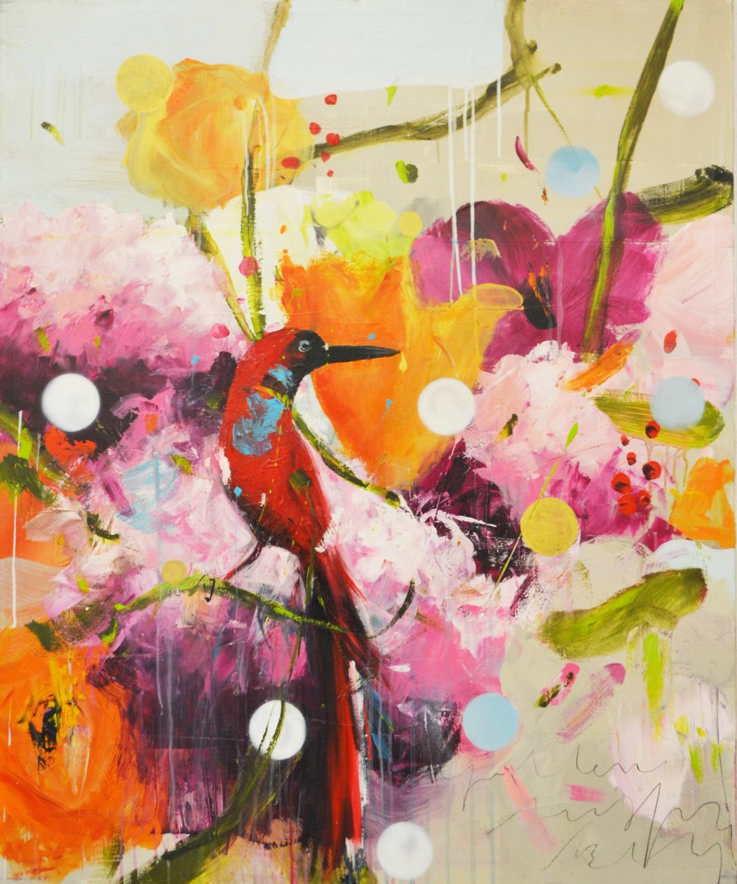 momentaneo della natura e della sua risplendente provvisorietà. A questi elementi spesso aggiunge sulle tele parole,
