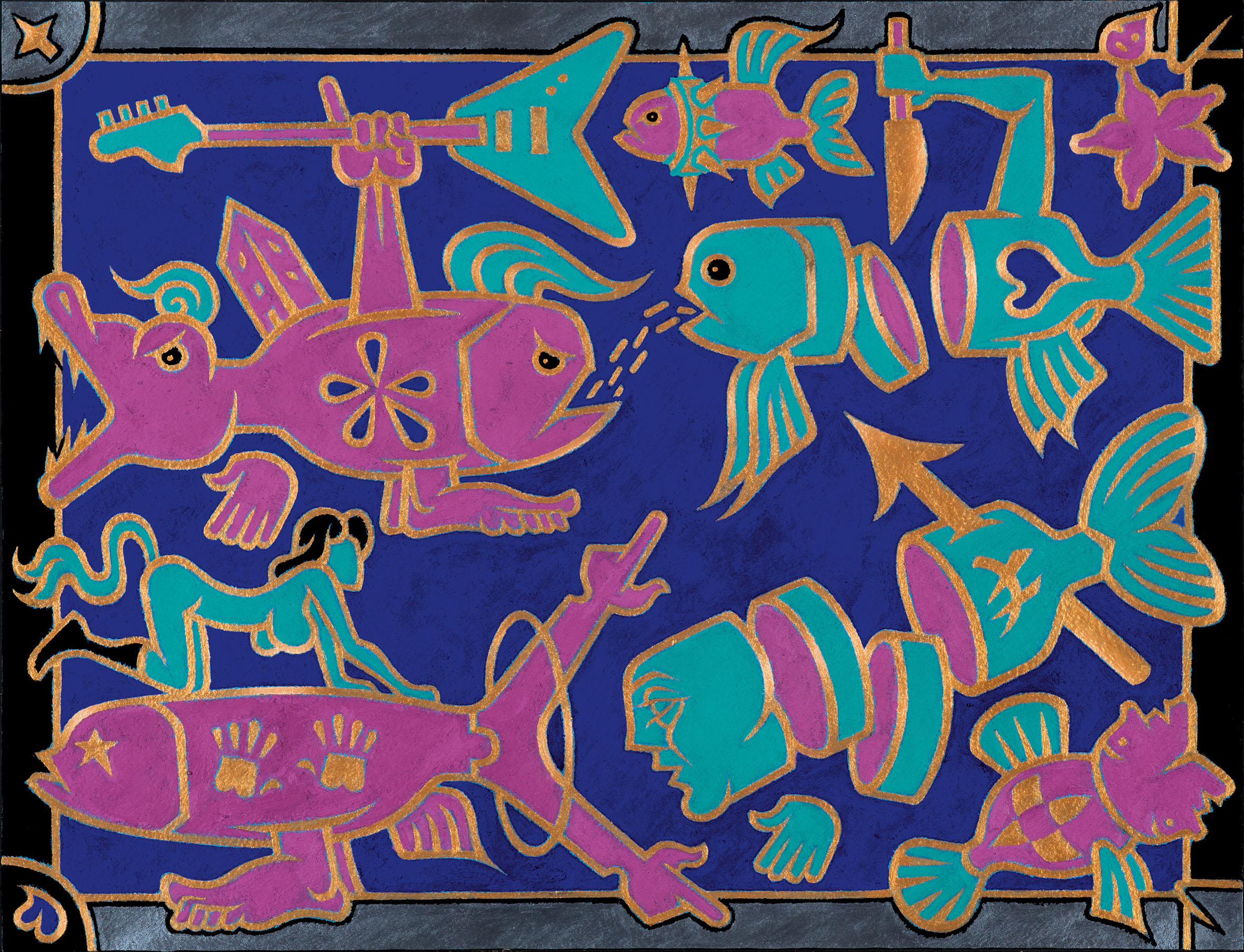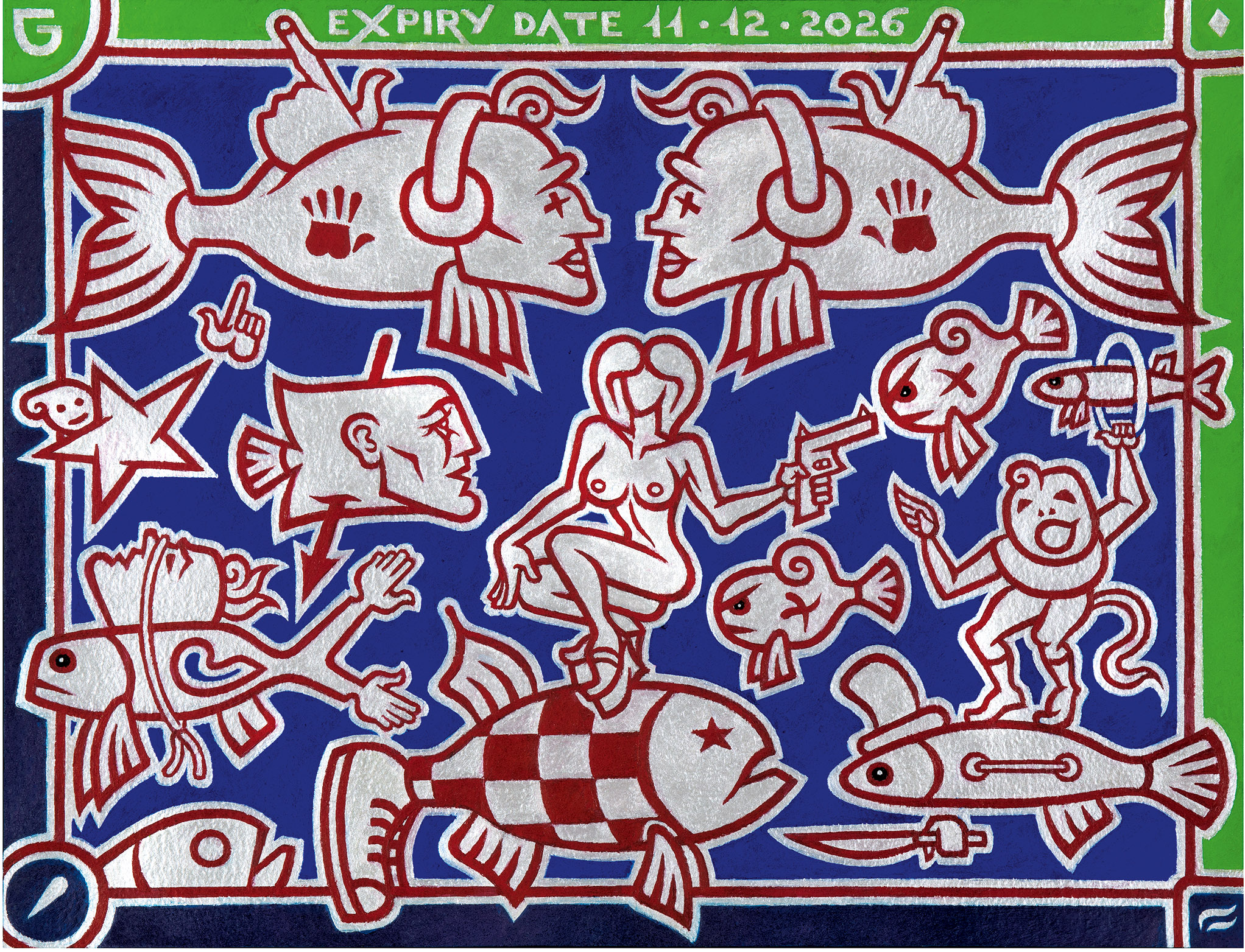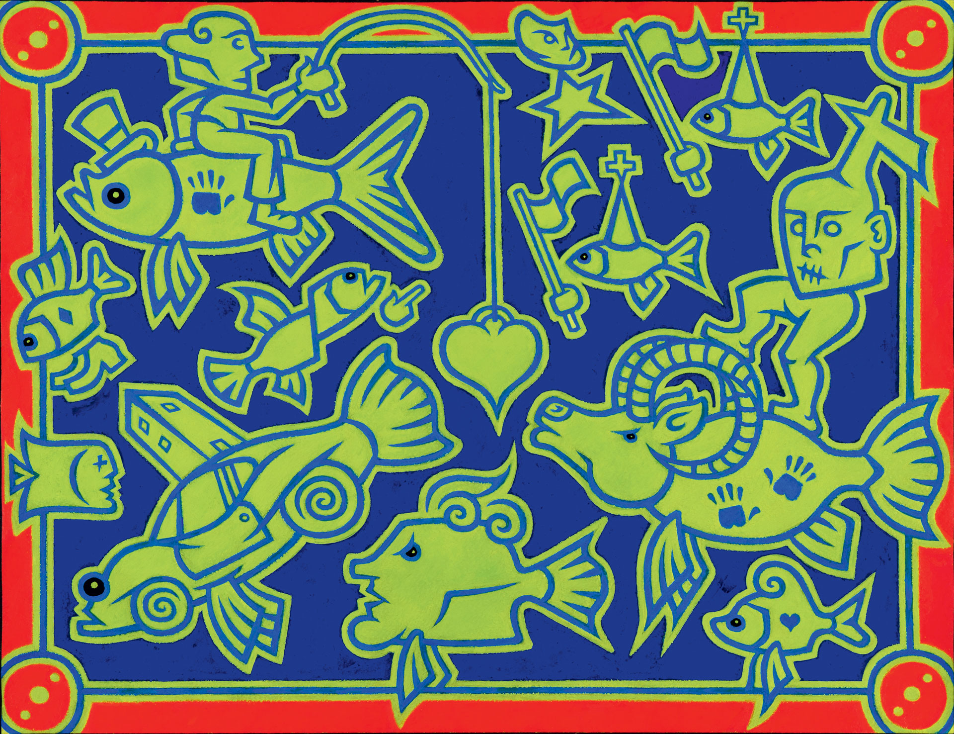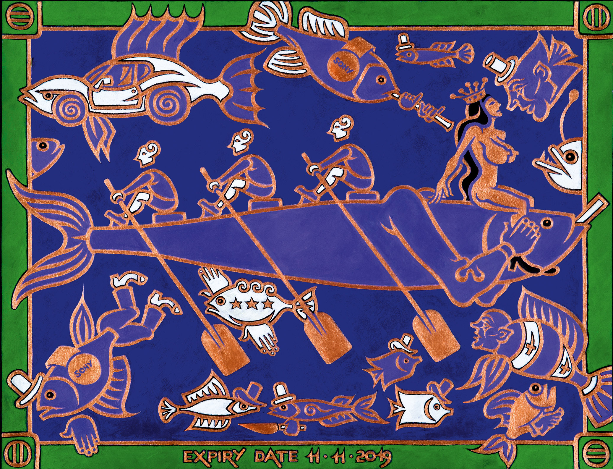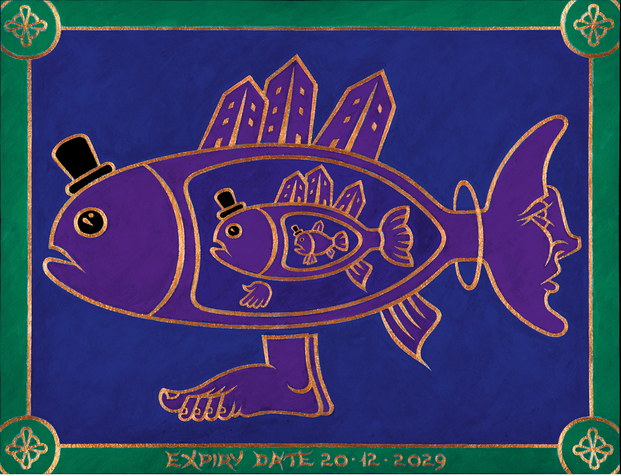 Pesci surreali con tratti molto umani, stracarichi di elementi e di particola-ri, in un horror vacui che riflette i meccanismi di accumulo e straniamento della nostra società contemporanea e ci suggerisce profonde riflessioni sull’arte del vivere.