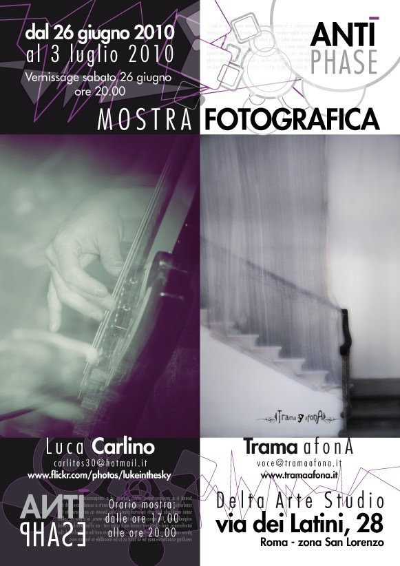 TRAMA AFONA viene alla luce nel 2005. Sul fronte visivo, intraprende una ricerca fotografica, sconfinante di quando in quando nella grafica e nella produzione video. Anima solista, che però spesso e volentieri ama insinuarsi in altre realtà (teatro, documentario, editoria, grafica CD, proiezioni durante concerti e letture di poesia, fotografia di reportage). Ospite della galleria Le Tele Tolte di Calcata (VT) e Capalbio (GR) da ottobre 2006. Collabora con la RAI (La Storia siamo noi) ed ottiene riconoscimenti in concorsi nazionali.