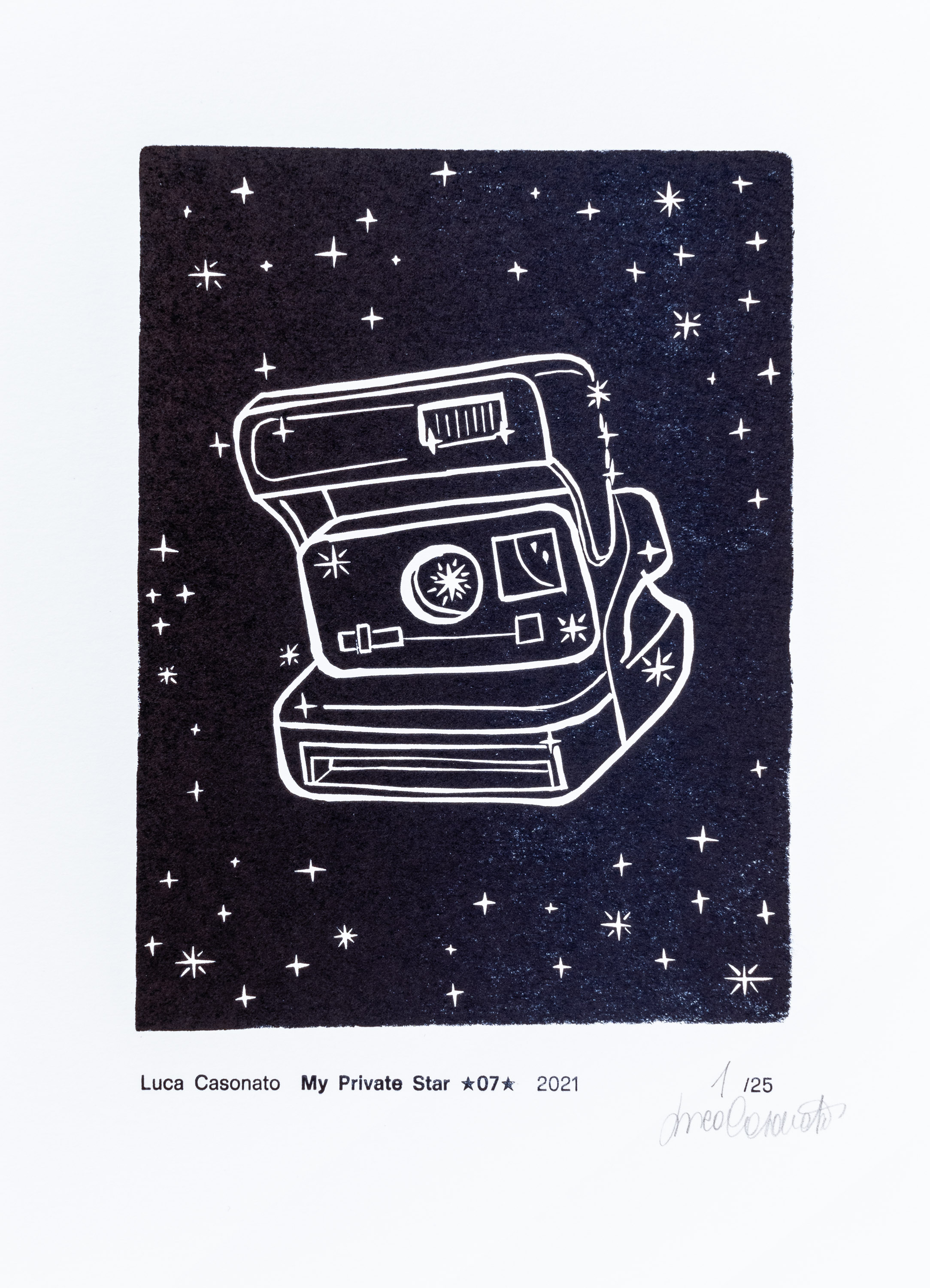 “My Private Star è un nuovo zodiaco, creativo e contemporaneo, nel quale i segni sono veramente legati alla nostra vita.” Così scrive Luca Casonato nel suo abstract di presentazione di questo progetto che coinvolge 12 linoleumgrafie da lui progettate e legate ai segni zodiacali. Molti artisti si sono misurati nella re-interpretazione dello Zodiaco ad esempio Mimmo Paladino, Tommaso Casella etc. Tutti però dentro il segno pittorico e nell’intenzionalità di una simbologia comunque artistica. Qui invece c’è proprio un salto diretto di qualità che non rimanda ad alcun legame con il Segno Zodiacale se non per l’inglobare le stelle dei segni dentro il simbolo privato “inventato” da Luca Casonato. Quindi il Carro, il Toro, Il Capricorno, l’Acquario, l’Orsa Maggiore o Minore etc... non appaiono più mediati per tramite di simboli pittorici, bensì sono mediati da oggetti del quotidiano della vita del fotografo, il Casonato. Niente di più esatto e meno “finto” del simbolo artistico in quanto come diceva Rudolf Steiner (in un suo libro) dei Caldei che di questi si poteva vederli camminare con il filamento della loro stella legato al corpo. In quanto in quei tempi si parlava e si discuteva continuamente di religione, e di che altro si poteva parlare? Gli Dei erano vivi e vegeti e facevano la loro impressione sulle genti. Per cui le stelle erano legate ad ognuno di noi. Così che ancora oggi si dice: “ringrazia la tua buona stella”!! Per cui gli Zodiaci di Luca Casonato sono cari a noi che finalmente ci ritroviamo nel nostro fare quotidiano, nella nostra esistenzialità di routine.