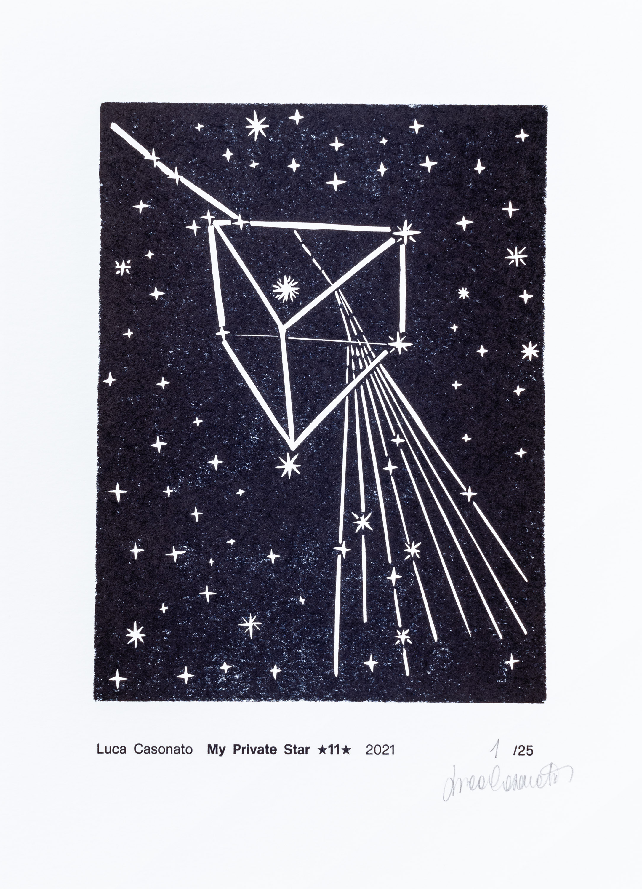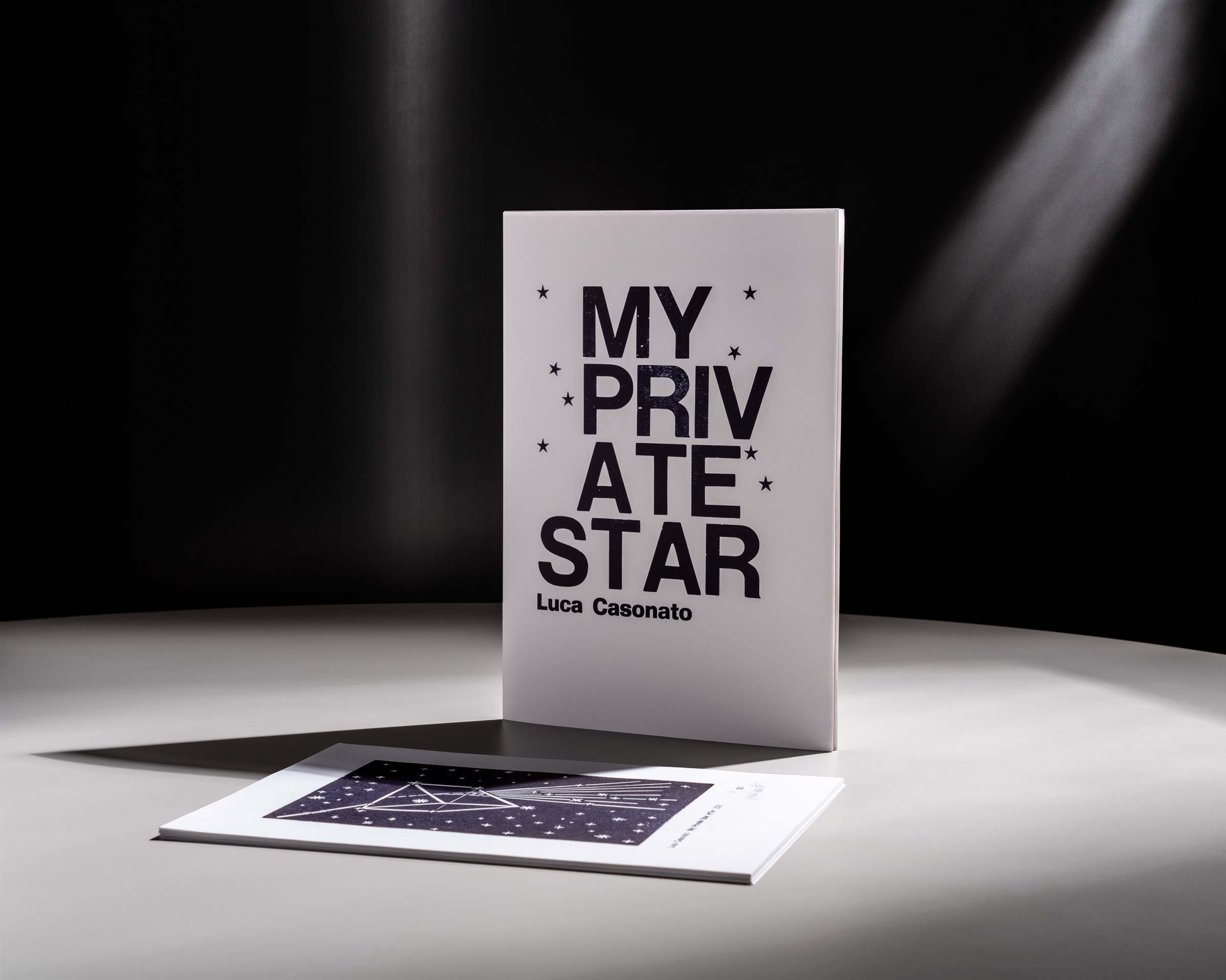 My Private Star è composto da 12 incisioni con testo a caratteri mobili stampate in formato 21,7x30cm su carta ecologica di alta qualità, raccolte in una preziosa cartella e corredate da un titolo interno stampato su carta color cobalto e da un indice. Ciascuna opera è in tiratura limitata di 25 copie, numerata e firmata dall’autore.