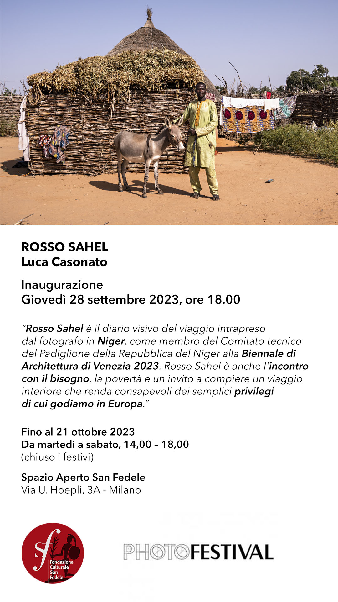 “Rosso Sahel” è un invito a utilizzare la fotografia e le immagini come occasione per compiere un viaggio interiore, per chiedersi come sfruttare al meglio quell’alternativa che fortunatamente abbiamo a disposizione. “Rosso Sahel” è anche un libro autoprodotto esposto presso il Padiglione della Repubblica del Niger alla Biennale di Architettura di Venezia 2023.