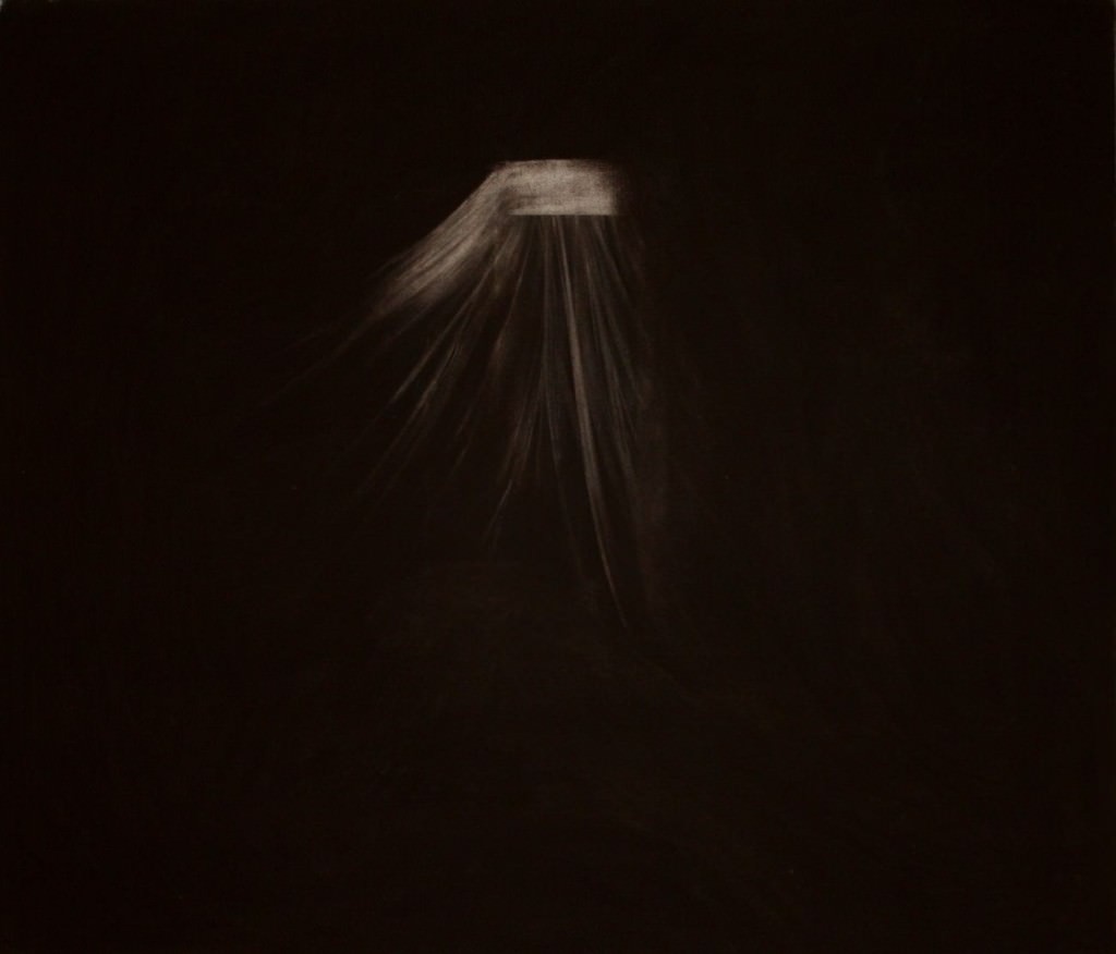 Luca Cutrufelli si spinge oltre, nel cuore della città, nel regno sotterraneo, per individuare le radici della sua forma “naturale”. I bottini, l’acquedotto senese che si dipana in cunicoli, grotte e gallerie che corrono sotto la città, rappresentano l’inizio di un percorso ascensionale (quasi dantesco) che termina nelle intense fughe architettoniche, negli slanci verticali dei suoi palazzi, fra i vicoli stretti dove la luce filtra abbagliante nell’oscurità degli archi e dalle feritoie nei muri spessi anche un metro per contenere gli assalti. Bagliori che riemergono dal nero dei suoi carboncini, in mostra, come una breccia nella superficie uniforme e indifferenziata, aprendo spazi che s’illuminano come un mondo nuovo senza ombre, dove scie di luce inseguono la sorgente e fuggono le tenebre. “Quando disegno e stendo questa superficie nera, buia, profonda, di carboncino, mi sembra di avere l’universo davanti ai miei occhi, di muovermi in uno spazio infinito. Dove in quel momento nulla è visibile ma tutto è presente e può venire alla “luce”. Sta a me essere in grado di trovarlo, nulla mi è precluso.” racconta l’artista in conversazione con Stella Santacatterina.