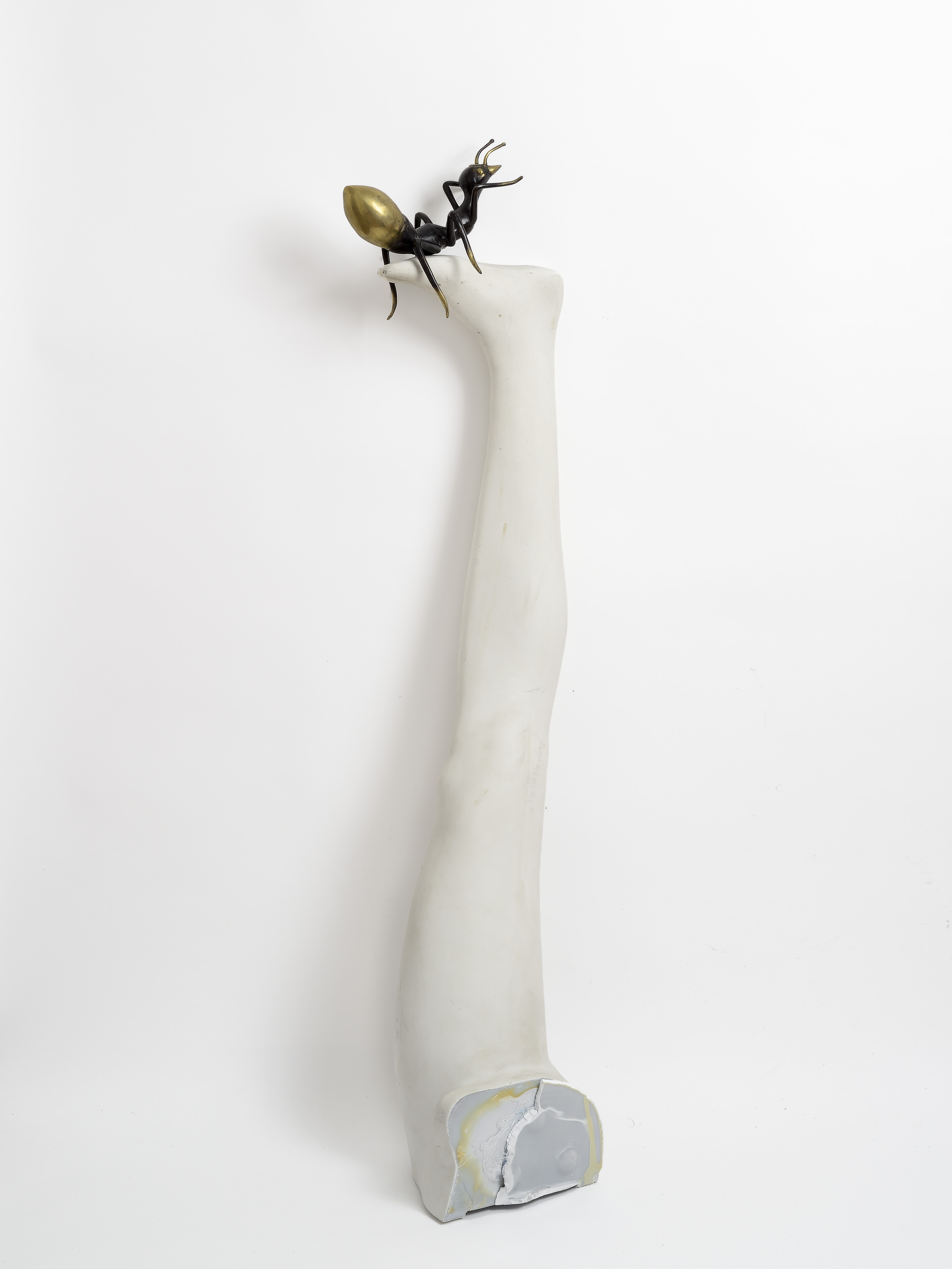 Al centro della sala troviamo una gamba anatomica capovolta, sormontata da una grossa formica in bronzo; nell’angolo, proseguendo sul piano verticale, è appoggiato un bastone fuori scala, ottenuto unendo differenti parti di bastoni esistenti convertite in moduli.