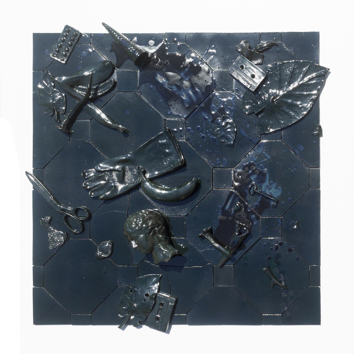 Il percorso espositivo comprende una trentina di opere, tutte realizzate dal 2017 ad oggi, secondo una tecnica originale che associa l’uso della terracotta ceramica dipinta ad objets trouvés, legno e plexiglass. Tra i lavori principali, si segnalano i “Pavimenti d’ombre”, resti di banchetti che costituiscono una tragica testimonianza di un mondo attonito, smarrito e immobile, e i “Pavimenti” neri, inghiottiti nel buio e ricoperti da un manto spesso color petrolio. Sono inoltre esposte le “Cariatidi”, moderni obelischi regolati dalla tecnica dell’accumulo, che non sfuggono al tema della vanitas, e gli inediti “Breviari”, nei quali il linguaggio si fa più rarefatto ed essenziale.