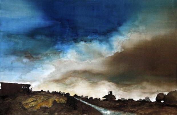 Il cielo è poi una continua elaborazione, un continuo cambiamento e stravolgimento dell’idea iniziale: bitume, acrilici, stracci, pennelli, gessetti creano nuvole, ombre, luci che si sviluppano in modo “autonomo” e quasi incontrollato con l’avanzare del lavoro.