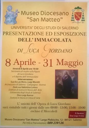 Venerdì 8 aprile 2016, alle ore 10.30 presso la Sala Conferenze del Museo Diocesano S. Matteo si terrà la presentazione e l’apertura dell’esposizione del dipinto dell’Immacolata di Luca Giordano, seguito da un seminario di studio sulla figura dell’artista e dell’opera