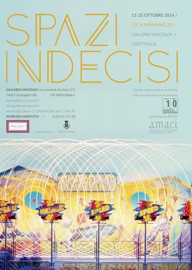 La mostra “Spazi Indecisi”, è un’iniziativa inserita nell’ambito della Giornata del Contemporaneo, promossa dall’Amaci, Associazione dei musei d’arte contemporanea e ha ottenuto il Patrocinio della Città di Grottaglie, e vuol far conoscere le opere di Luca Marianaccio, fotografo e architetto, proponendo al pubblico la sua innata capacità di mostrare, attraverso uno sguardo disincantato, come l‘apparente immobilità del paesaggio sia testimone e prova dei mutamenti della nostra realtà. Le sue foto, frutto di un certosino lavoro di ricerca , non vogliono sorprendere, né tantomeno consolare l’occhio di chi le guarda, ma vogliono suscitare una riflessione profonda ed invitare a guardare i “luoghi” e “non luoghi” del nostro percorso quotidiano e quindi anche dentro noi stessi con maggior lucidità e etica attenzione.
