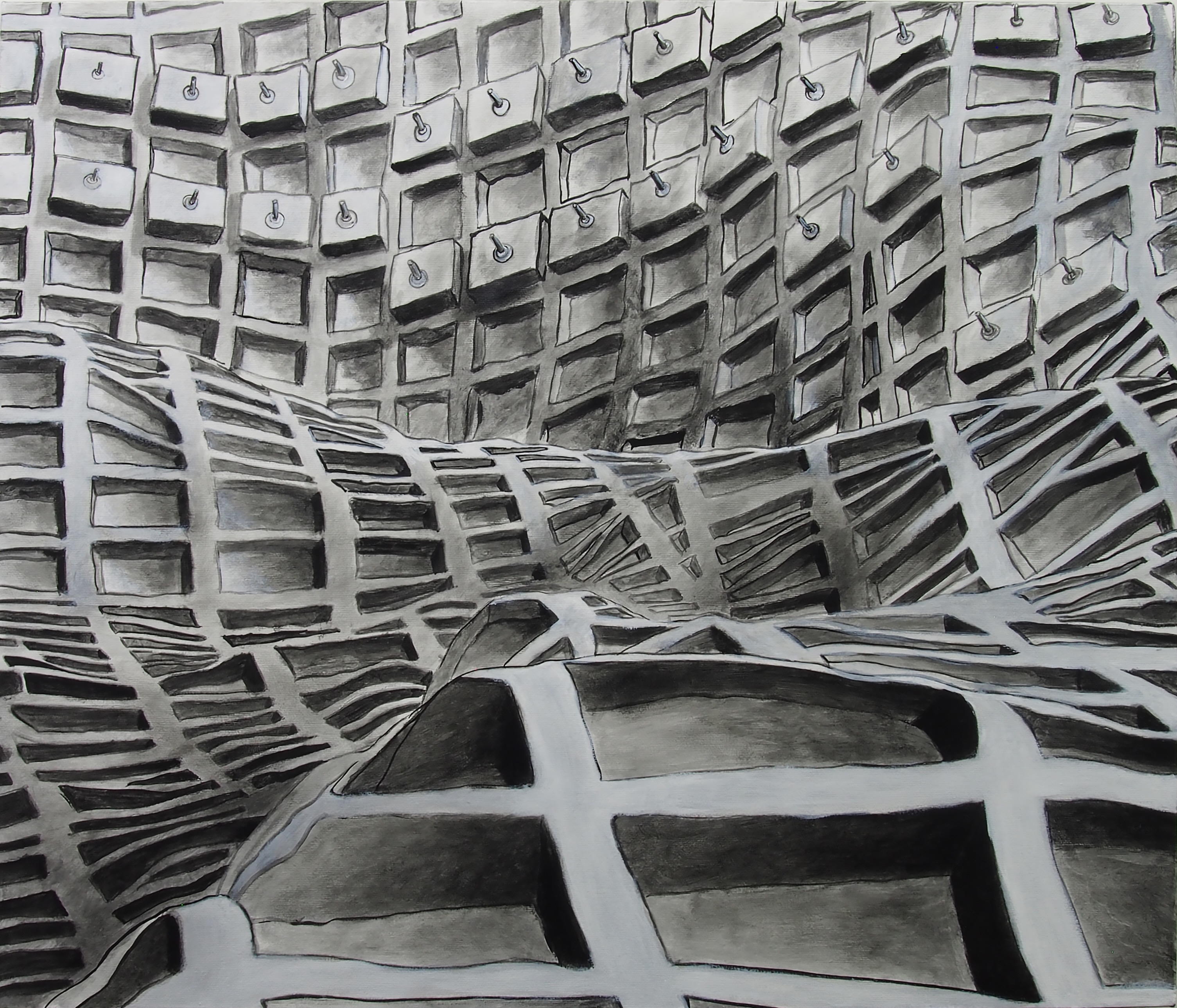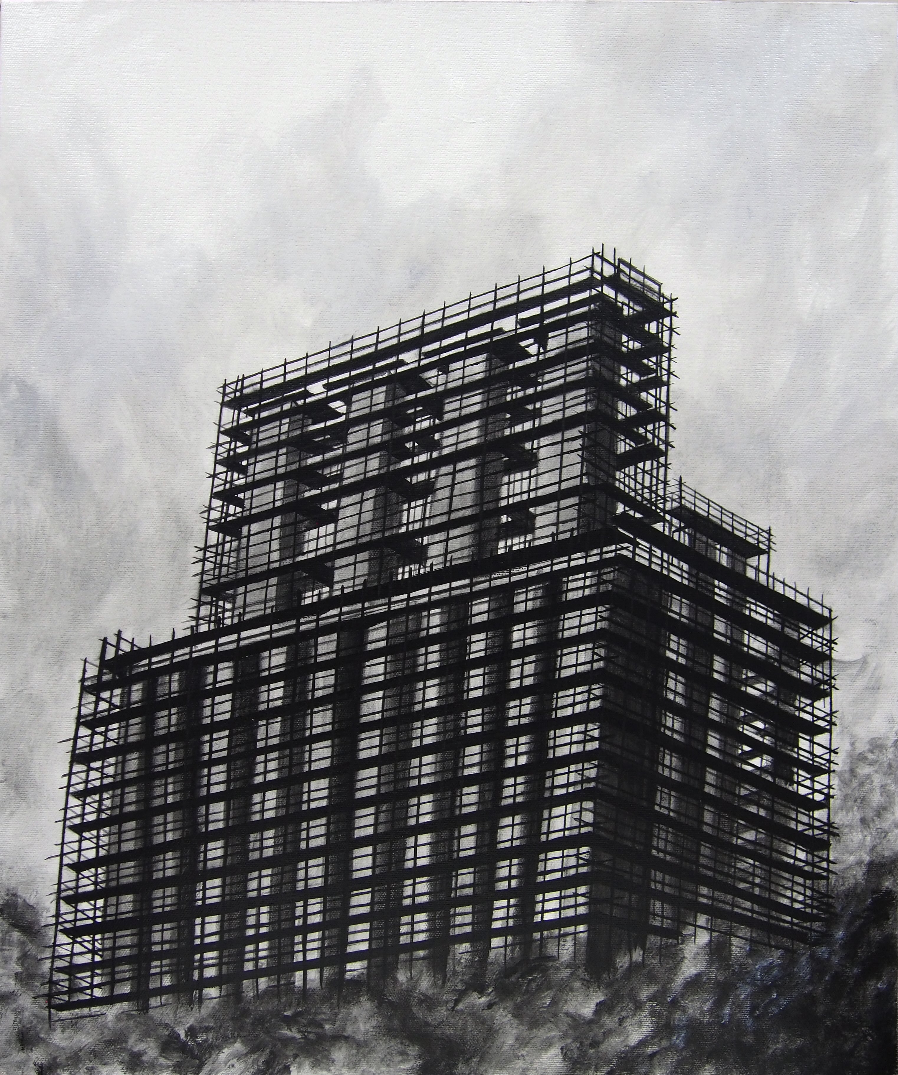 Potrebbe sembrare una collaudata avventura della nostalgia, indirizzata a recuperare il fascino dell'archeologia industriale. Ma in verità i conti non tornano, manca sempre qualcosa, oppure vediamo qualcosa di troppo. Vengono dal passato o dal futuro queste strutture? Difficile dirlo con certezza. Matti dipinge sempre oggetti e figure trasportando tutto fuori da un preciso orizzonte temporale. L'edificio interamente ricoperto dalle impalcature – vagamente minaccioso - a quale epoca appartiene ? E' una rovina disabitata? Lo scheletro di un albergo in costruzione? Una prigione del futuro?