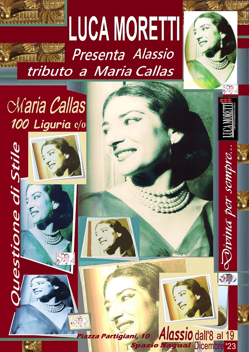 Al via ad Alassio dall’8 al 19 Dicembre un sensazionale esclusivo tributo ideato dallo stilista ligure Luca Moretti allo stile di Maria Callas “ divina per sempre ” in occasione del centenario dalla sua nascita 1923-2023, presso la Galleria d’Arte Orafa Nagual in Piazza Partigiani 10 tra pietre splendenti e gemme naturali, visitabile al pubblico con orario 16.00/19.00 per poi concludersi il 21 a Monaco Monte-Carlo.