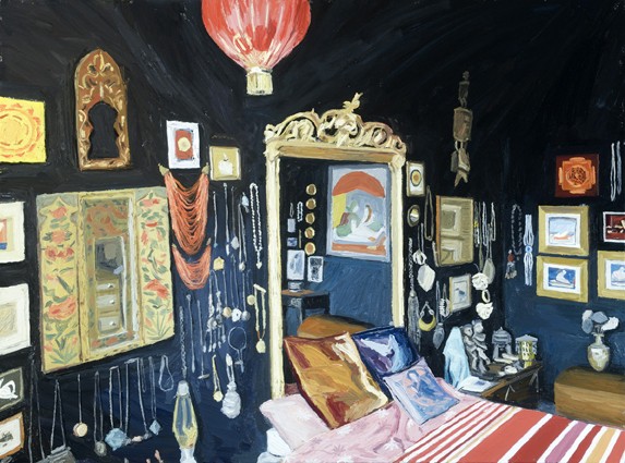Interni che hanno la freschezza di un’istantanea e la lentezza ragionata della pittura. Stanze di una casa raccontata nei dettagli più minimi, nei gioielli attaccati alla parete e nel copriletto a righe, nella sovrapposizione dei quadri ordinati in file e negli oggetti più cari avvicinati come amuleti su una mensola