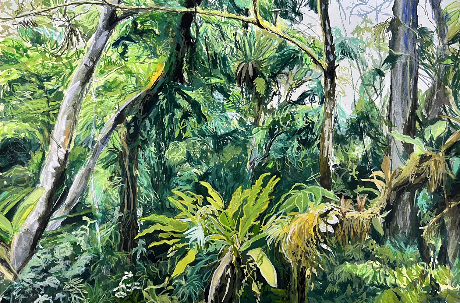 Alla luce della recente pandemia e della crisi ecologica costantemente in atto, la natura mostrata dalla pittura di Luca Padroni, pur selvaggia e piena di pericoli, comunica un senso di ristabilito equilibrio e persino di serenità, mettendo in scena sia una memoria personale dell’artista, che insieme alla famiglia ha vissuto parte dell’infanzia in Africa tra Mozambico, Sudan e Namibia, sia una memoria ben più lontana, archetipica e transgenerazionale, che non permette in realtà di associare le scene dipinte da Padroni a un’unica e particolare area geografica della terra.