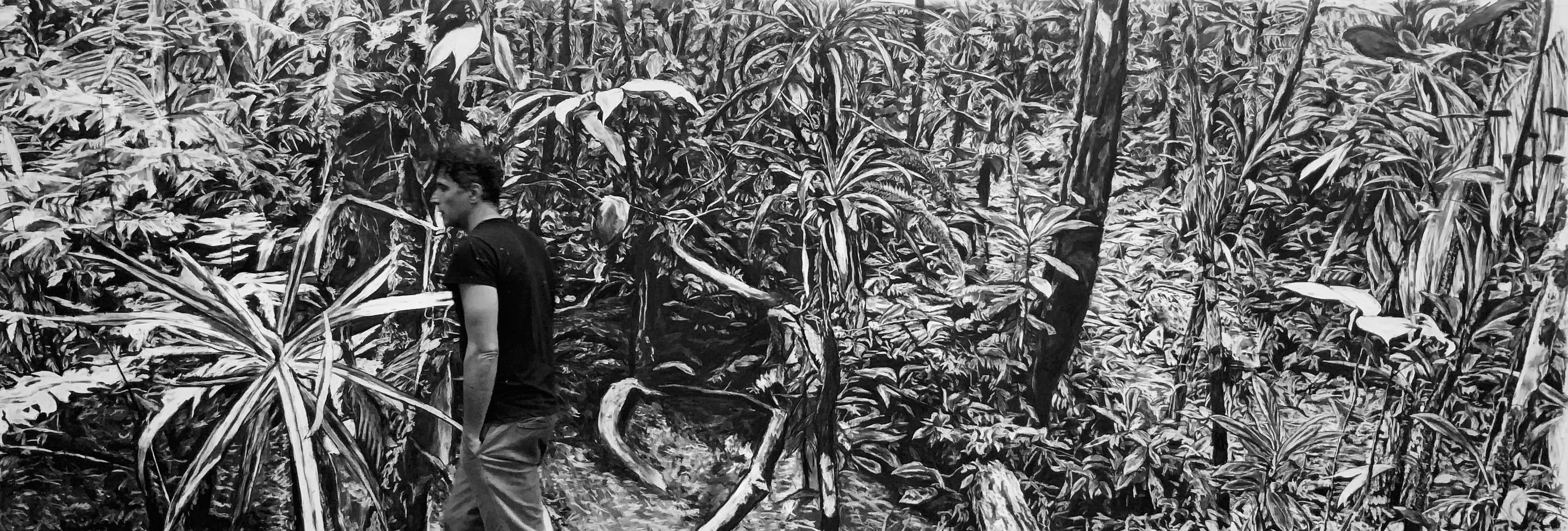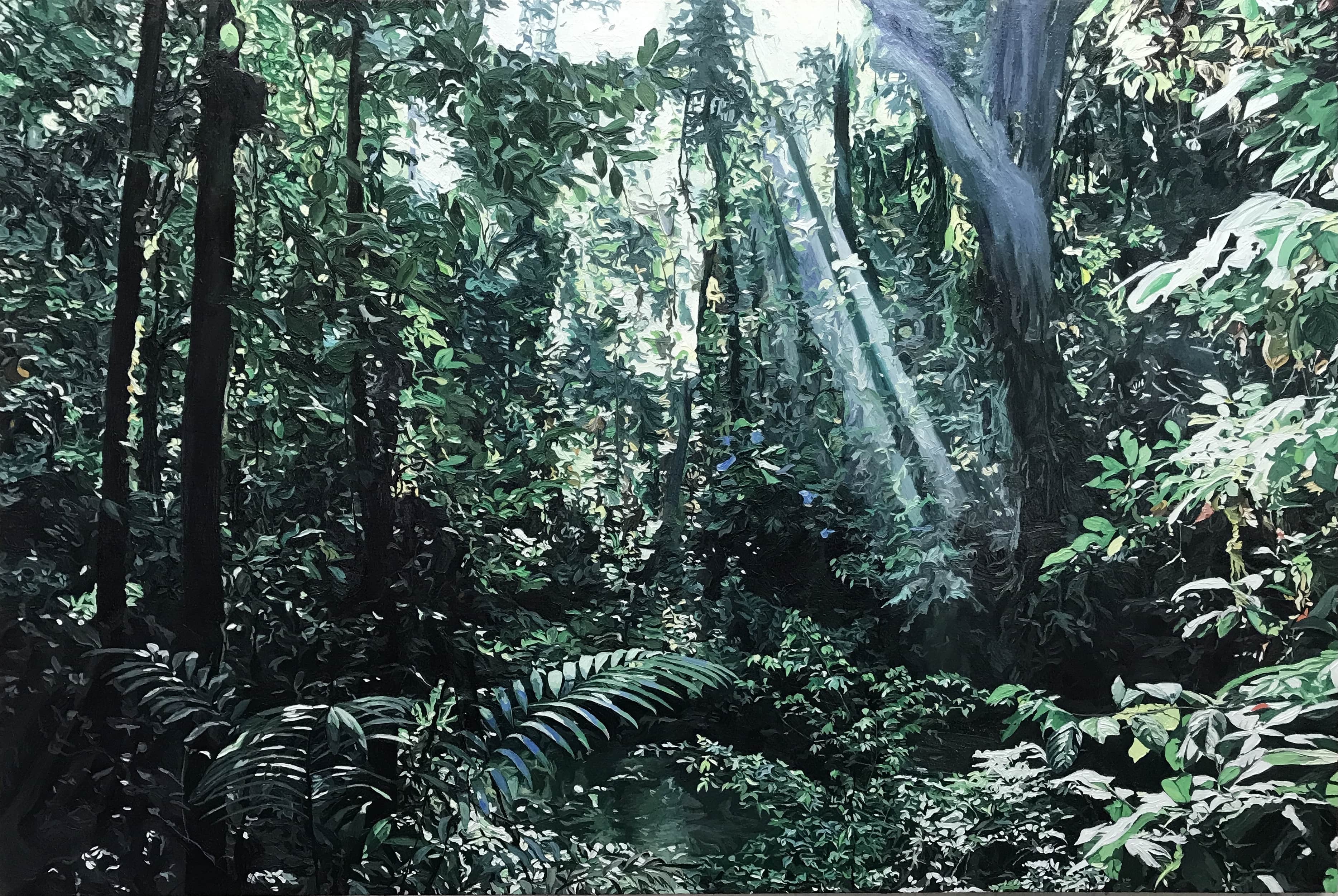 LUCA PADRONI ha una formazione particolarmente internazionale. Ottiene prima un diploma (BTEC) presso il Kent Institute of Art and Design, poi la laurea in belle arti (BA) presso la Slade School of Fine Arts di Londra. Nel 2001 vince una borsa di Studio Fulbright e frequenta il San Francisco Art Institute. Attualmente vive e lavora a Roma dov’è anche nato. Fin dall’inizio la sua attività pittorica è caratterizzata da disegni e studi di piccolo formato, a olio, che si evolvono in dipinti monumentali dove domina una gestualità molto vivace e un uso potente del colore. Avendo trascorso l’infanzia in vari paesi africani, tra cui il Sudafrica, l'artista ha sviluppato un fascinazione speciale per la natura, ora più che mai minacciata dal nostro stile di vita sempre più distante dalle sue regole. La foresta pluviale non è solo il luogo dove la vita si manifesta nelle sue forme più affascinanti, è anche dove la luce del sole si fa strada faticosamente, è un luogo di ombre che possono nascondere una minaccia, è un luogo da temere.