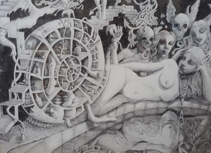 L’istinto diviene così la liturgia di una religione mistica, che mai si dichiara, perché si esprime senza parole; i sensi animali sono i simboli di un mondo spirituale che ama, odia, spera e si avvicenda parallelamente al mondo degli uomini; ma anche il mondo di noi primati ‘addomesticati’ imita quello, poiché l’istinto è il veicolo primario della mente e dello spirito e dunque di ogni evoluzione. L’esposizione presenta opere dalle complesse elaborazioni spaziali in cui si riconoscono motivi mitologici e zoomorfi, episodi metamorfici, filosofie per immagini, resi con tecniche espressive diversificate (disegno, incisione, pittura ad olio, scultura in pietra e marmo e modellato in terracotta).