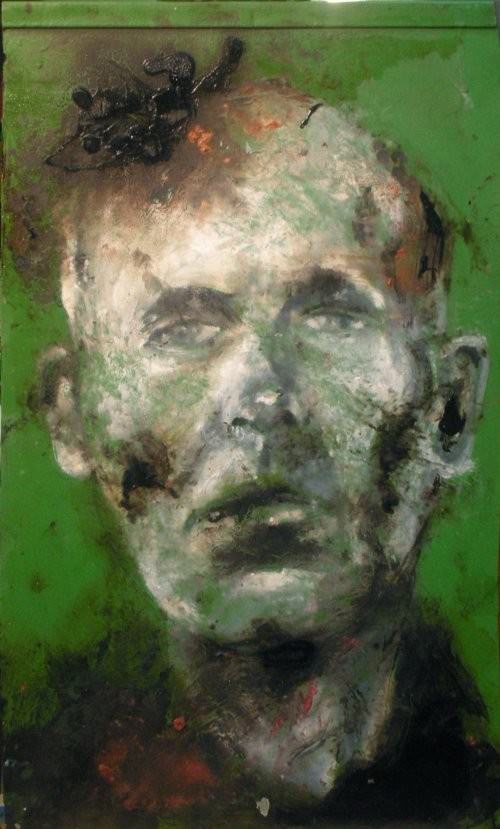 Senza arrivare agli estremi di illustri esempi, come i sacchi e le combustioni di Alberto Burri e i frammenti di elementi naturali quali pagliuzze, argille e ceralacca applicate alle tele da Anselm Kiefer, Zarattini accompagna l’uso dell’olio su lastra alla creazione di striature di ruggine, che conferiscono volume e accenni di tridimensionalità, oltre al sottolineare sapientemente lineamenti e aree in cui si suddividono i volti, accentuando le peculiarità di ogni soggetto.
