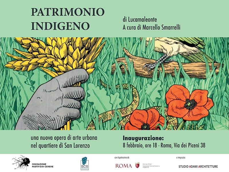 Venerdì 8 febbraio alle ore 18 la Fondazione Pastificio Cerere e SCS SVILUPPO IMMOBILIARE SRL sono orgogliose di presentare Patrimonio indigeno, un nuovo straordinario murales eseguito dall’artista Lucamaleonte, a cura di Marcello Smarrelli, realizzato nel quartiere di San Lorenzo, uno dei principali punti di riferimento per la street art romana.