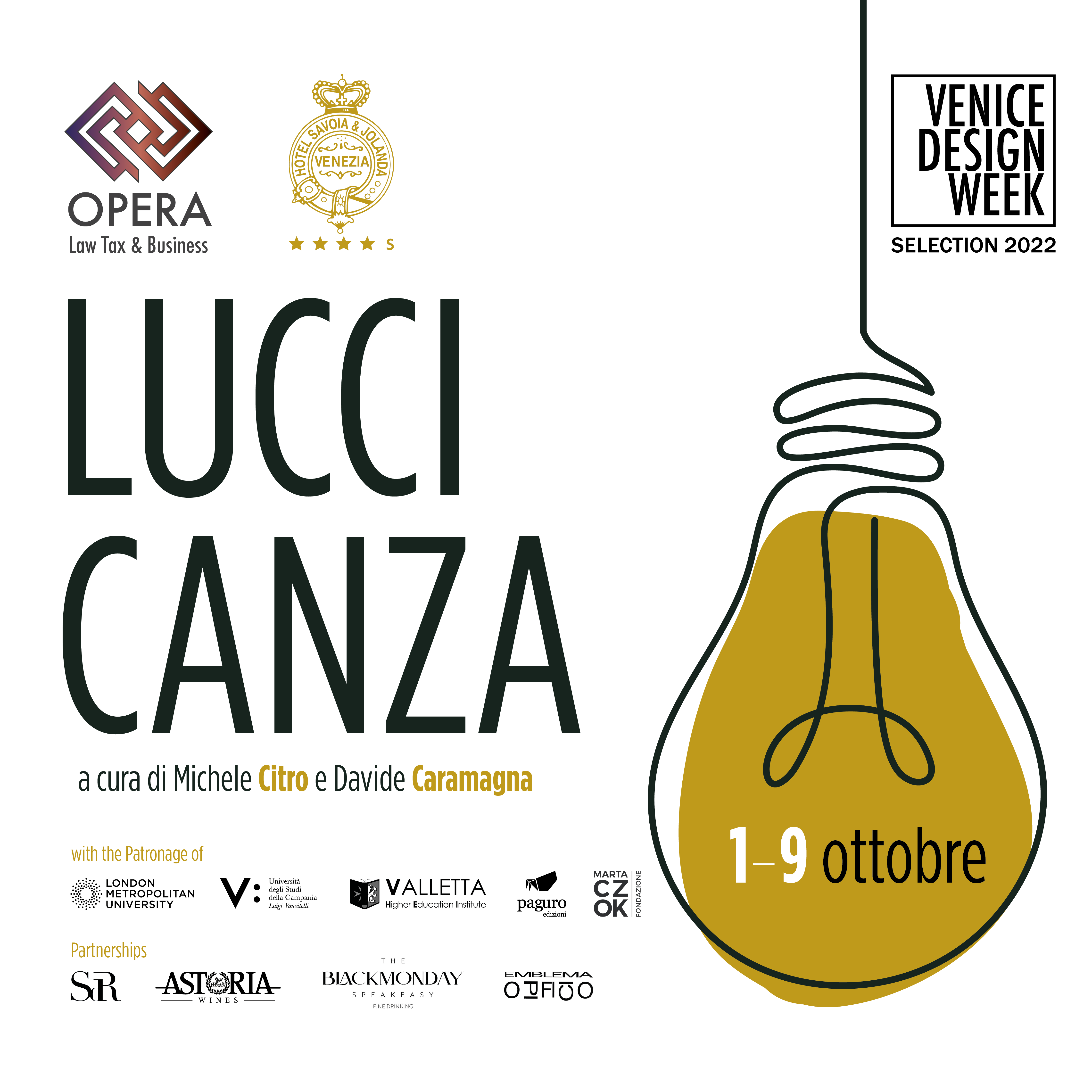 “Luccicanza. L’Arte celebra il Design a Venezia” gode, infine, del sostegno di importanti enti patrocinanti, quali la London Metropolitan University, l’Università degli Studi della Campania Luigi Vanvitelli, il Valletta Higher Education Institute, le Edizioni Paguro e la Fondazione Marta Czok; nonché di eccellenti partner, come lo studio di consulenza e pianificazione finanziaria Stefano Da Rin, Astoria Wines e The Blackmonday Speakeasy Fine Drinks.