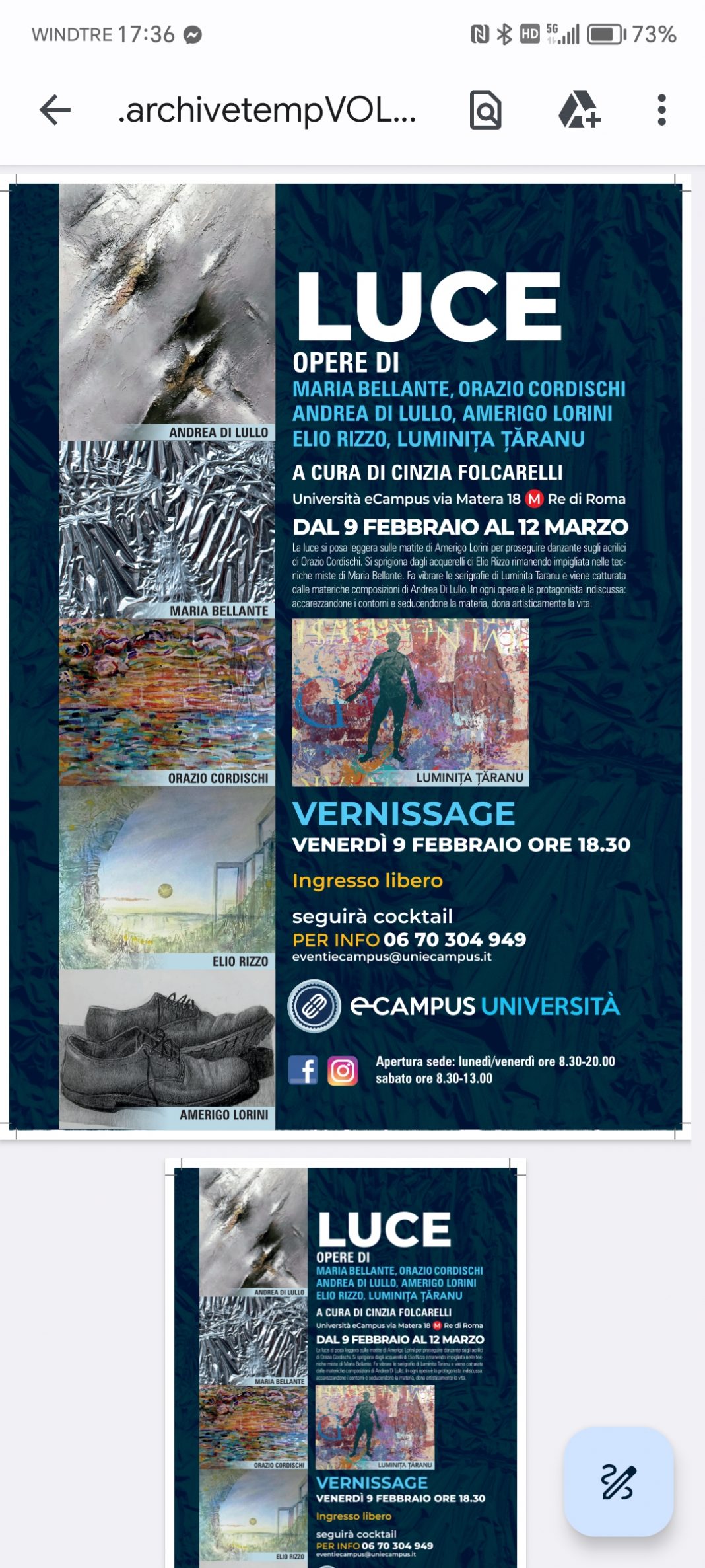 La luce si posa leggera sulle matite di Amerigo Lorini per proseguire danzante sugli acrilici di Orazio Cordischi. Si sprigiona dagli acquerelli di Elio Rizzo rimanendo impigliata nelle tecniche miste di Maria Bellante. Fa vibrare i dipinti serigrafici di Luminița Țăranu e viene catturata dalle materiche composizioni di Andrea Di Lullo. In ogni opera é la protagonista indiscussa.