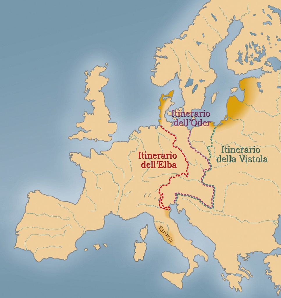 del Baltico, territorio principale di estrazione, con il Mediterraneo ed, in particolare, con l’Etruria.