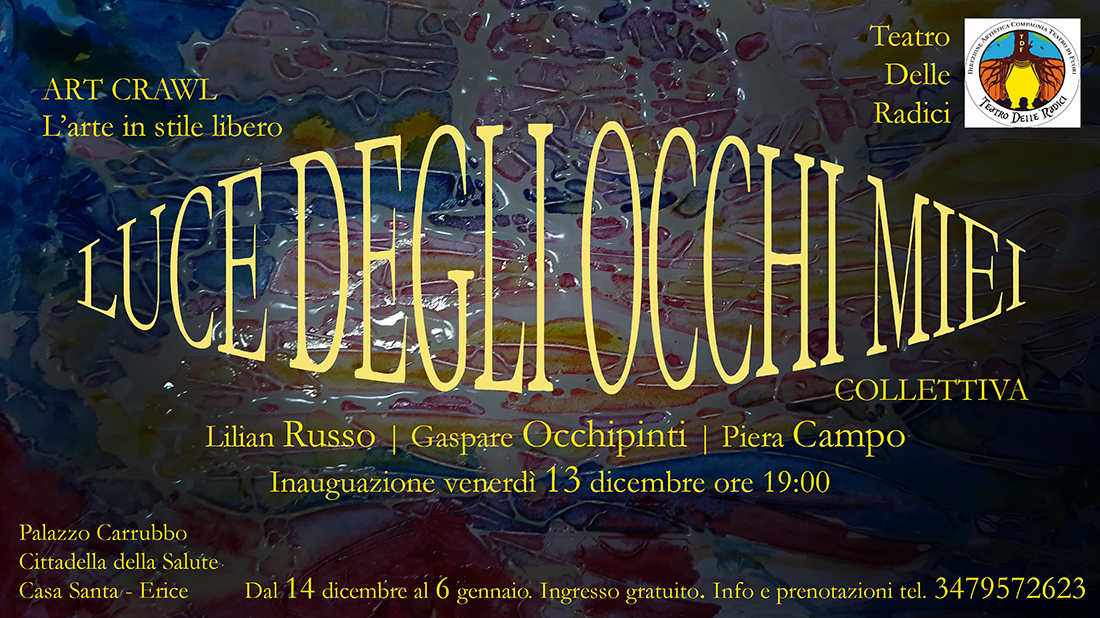 Inaugura venerdì 13 dicembre alle ore 19:00 a Palazzo Carrubbo presso la Cittadella dalla Salute a Casa Santa, Erice, negli spazi del Teatro delle Radici, “Luce degli occhi miei” un'esposizione collettiva d'arte visive contemporanee che accoglierà le opere di tre artisti: Lilian Russo, Gaspare Occhipinti e Piera Campo.