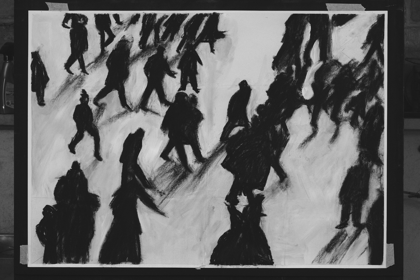 A quasi 10 anni dalla sua ultima personale negli spazi di Assab One, Pino Guidolotti torna con una mostra dedicata alla sua produzione meno conosciuta della fotografia, ma da sempre presente nella sua pratica artistica: il disegno. Una serie di nuovi lavori a carboncino su carta abita lo Studio 3. I disegni di grande formato scorrono senza sosta sulle pareti della sala. Pino Guidolotti veste i panni di un regista silenzioso e attento, mentre le immagini mostrate appaiono quelle di un qualche film muto, in bianco e nero. Senza mai tralasciare la sua visione fotografica, le scene parlano di vita quotidiana, di persone che passeggiano in uno spazio-tempo indefinito, di tavole vuote, ma imbandite, di bar e case dove dimorano ombre sconosciute.
