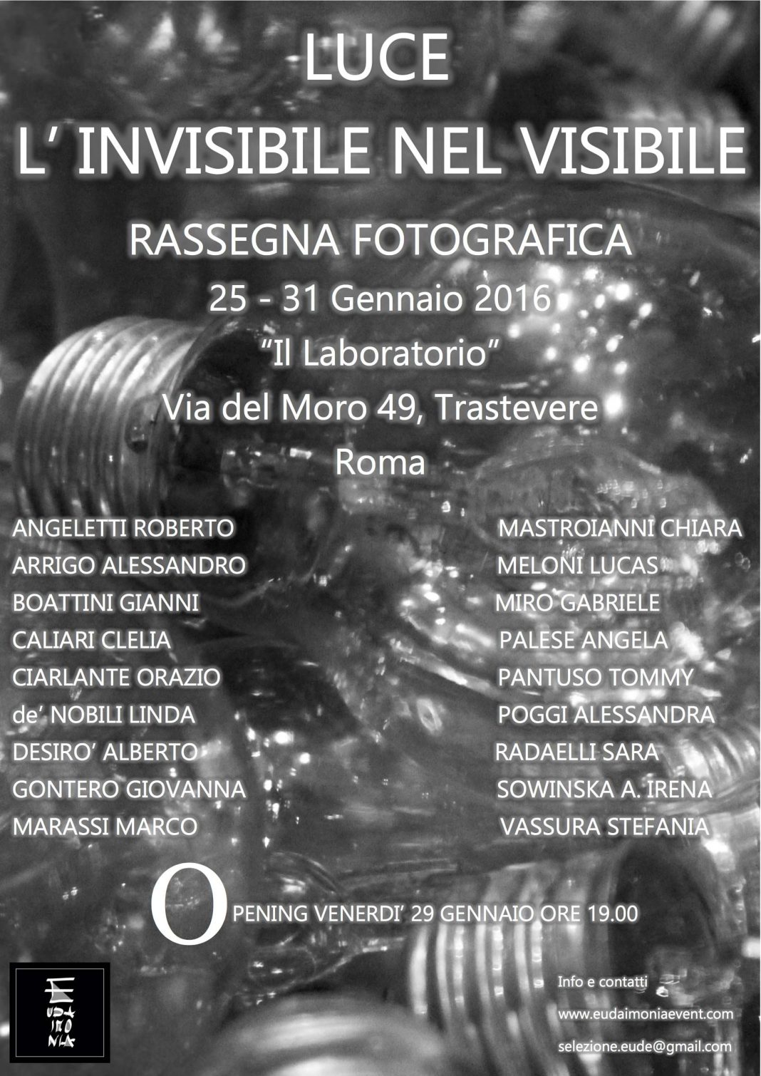 Nel cuore di Trastevere, un microcosmo che racchiude epoche, popoli e stili di vita, avvolto in un affascinante intreccio di strade e vicoli si terrà dal 25 Gennaio al 31 gennaio 2016, la mostra “ Luce: l’invisibile nel visibile ” presso la Galleria “Il Laboratorio”.