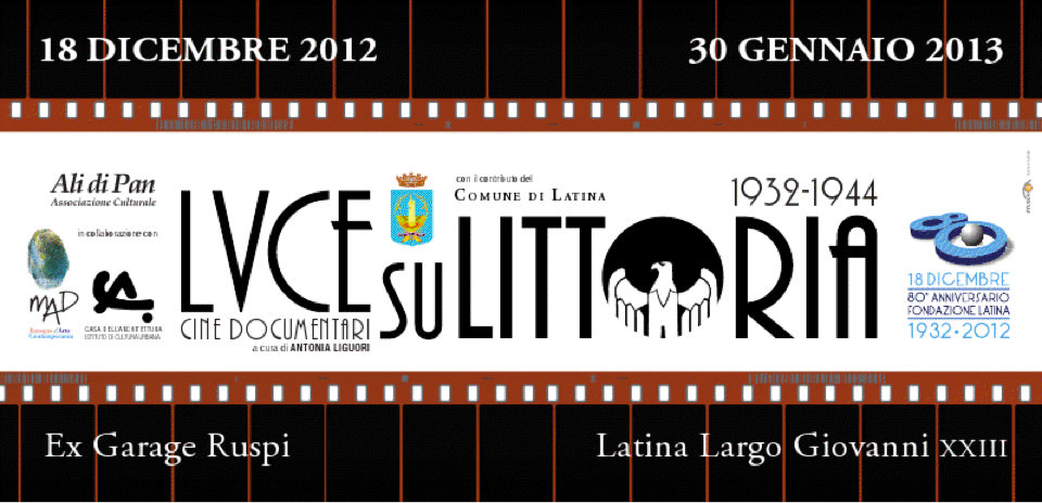 Martedì 18 dicembre alle ore 16,30 presso l’ex Garage Ruspi sarà inaugurata la mostra cine-documentaria “Luce su Littoria”, promossa dall’Associazione Culturale Ali di Pan, in collaborazione con MAD Museo d’Arte Diffusa e la Casa dell’Architettura e il contributo del Comune di Latina. Si tratta della proiezione a ciclo continuo di un dvd di 30 minuti commissionato dal Comune di Latina all’Istituto Luce, attraverso uno studio di ricerca, raccolta e selezione di Antonia Liguori per l’Università di Bologna, relativo ai cine-documentari che il Luce girò a Littoria nel periodo che va dall’anno di fondazione al 1940.