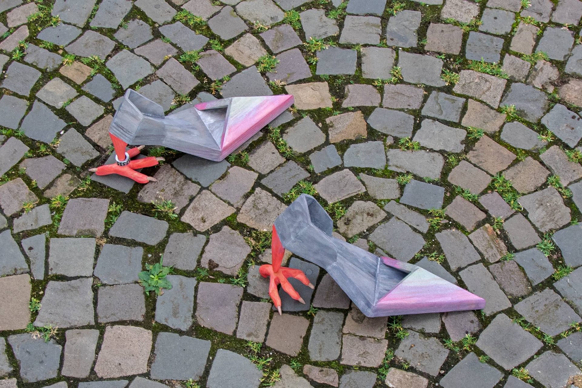 The work Luci D. Dreams of Flying opens the story with bizarre footwear — shoes with heels shaped like bird claws. Through this, the artist engages with a zoomorphic fantasy and imaginary hybridizations between humans and birds, reinterpreting a series of literary references.