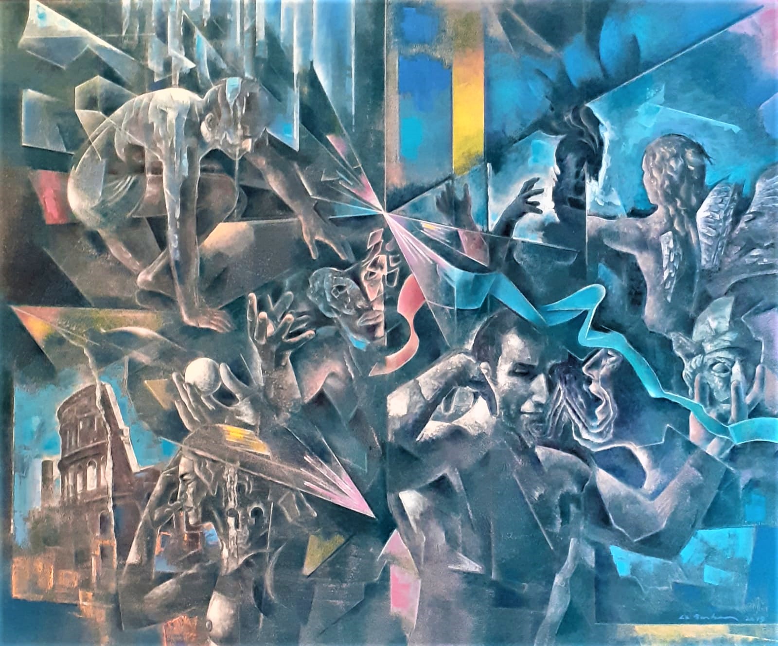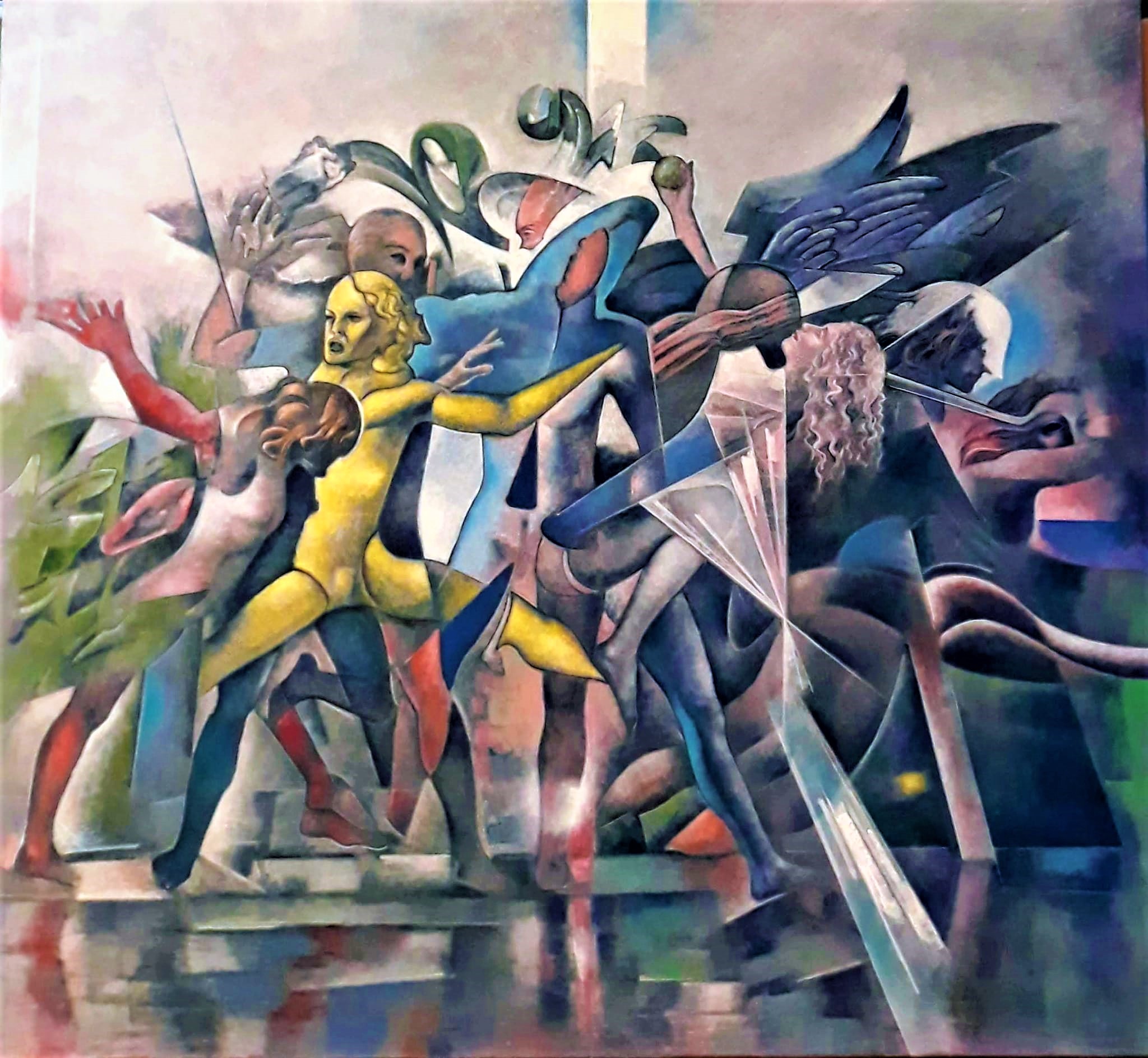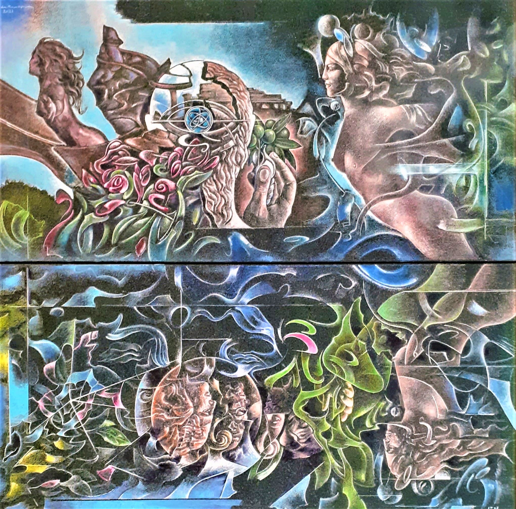 Caos come barocco di contaminazione di ogni cosa, di noi, sottolinea Francesco Gallo Mazzeo, una volta che abbiamo dato l’addio all’unico e ci siamo immersi in tutto e tutti nel molteplice che di esso è il fenomeno disseminato in tutte le direzioni, per cui esso si ritrova in ogni particella scrivendo le immagini di un suo tempo interiore, non necessariamente cronologico, in cui figure diverse compiono gli stessi gesti e diversi gesti connotano identiche figure che richiamano furori profetici, rituali, poetici ed erotici. Fertilità di una mente sempre in unisono con la mano, di cogliere l’intuizione dell’attimo fuggente, perché non c’è nulla di programmato ma tutto è filiazione di un sentimento panico, che avvolge come una pioggia d’argento che fa da liquido alchemico, come una infinita ricerca che non si ferma mai, perché preda di una passione che non ha un polo d’arrivo, ma punti d’osservazione che creano un territorio fantastico in cui tutto può accadere, in un’opera aperta, in cui i significati sono infiniti, mentre i significati sono conflittuali come nella Tempesta di Giorgione, come una nascita che non cessa mai nella trasparente morfosi delle idee.