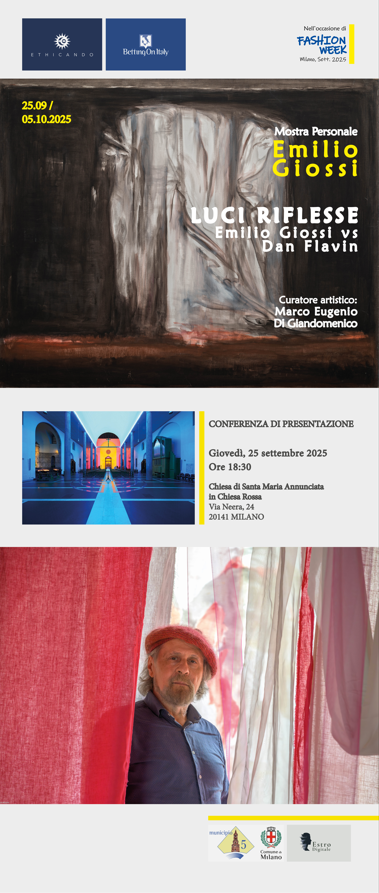 Giovedì, 25.09.2025, ore 18:30, nell’occasione della Milano FASHION WEEK, presso la Chiesa di Santa Maria Annunciata in Chiesa Rossa di Milano, è inaugurata la mostra personale LUCI RIFLESSE. EMILIO GIOSSI VS DAN FLAVIN di Emilio Giossi (25.09 – 05.10.2025), a cura di Marco Eugenio Di Giandomenico.