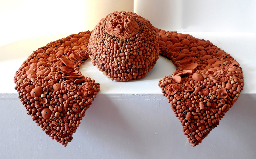 Un altro progetto proposto in mostra è Orecchiette/Helmets: si tratta di lavori nati dalla collaborazione spontanea della madre dell’artista, venuta poco a poco disabile a causa di malattia. In questo progetto il materiale utilizzato è l’argilla; la sua manipolazione è diventata uno svago piacevole, una sorta di gioco terapeutico che rimanda il ricordo della lavorazione della pasta fresca tradizionale della sua terra, le orecchiette della Basilicata. Quest’opera parla di una donna che nonostante tutte le sue sventure si da forza e come un guerriero si protegge con il suo elmo simbolico, ovvero il coraggio di andare avanti. Orecchiette/Helmets è realizzato da elementi rossi e marroni di terracotta non smaltati per elevare e rendere visibile la bellezza della semplicità.
