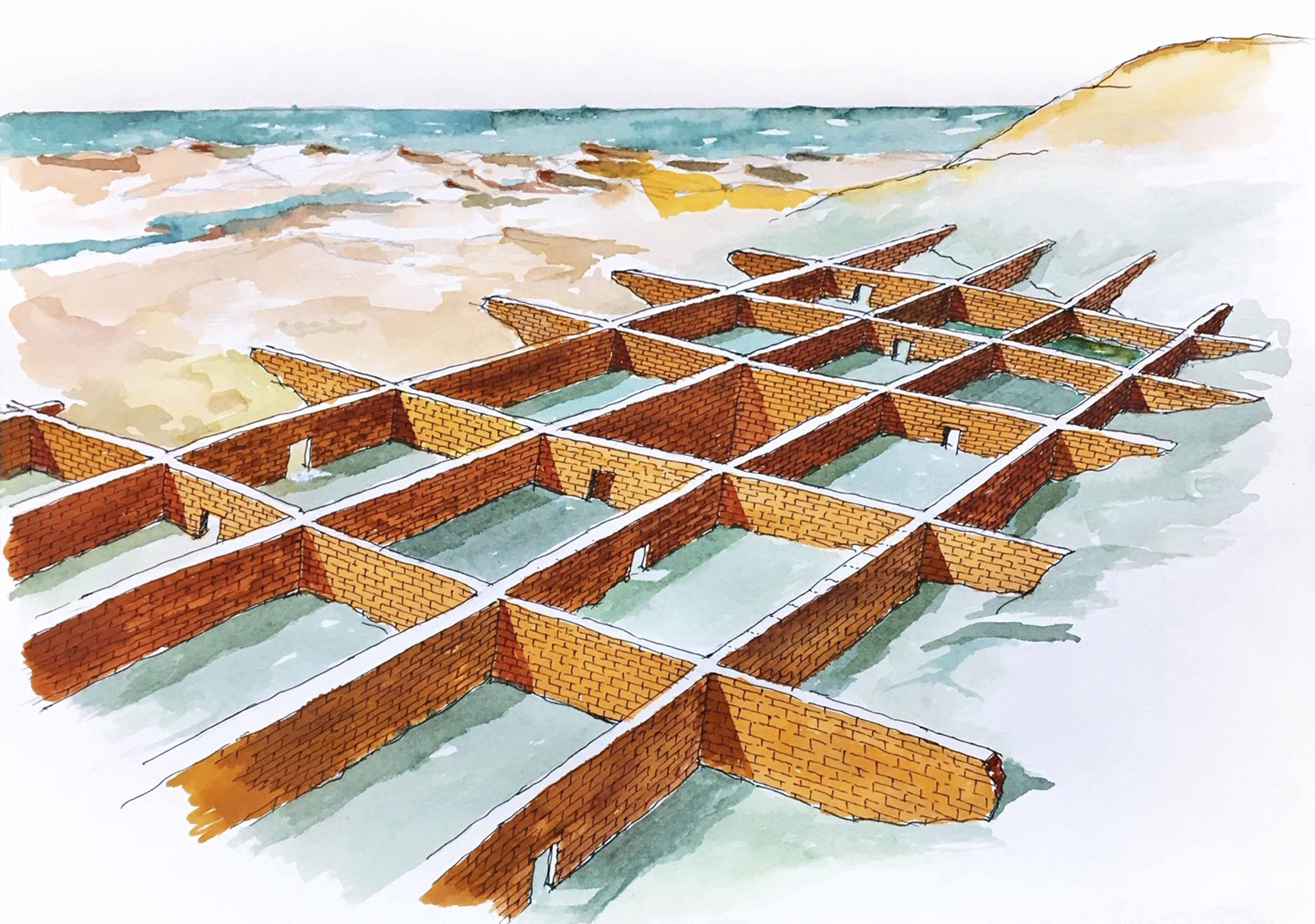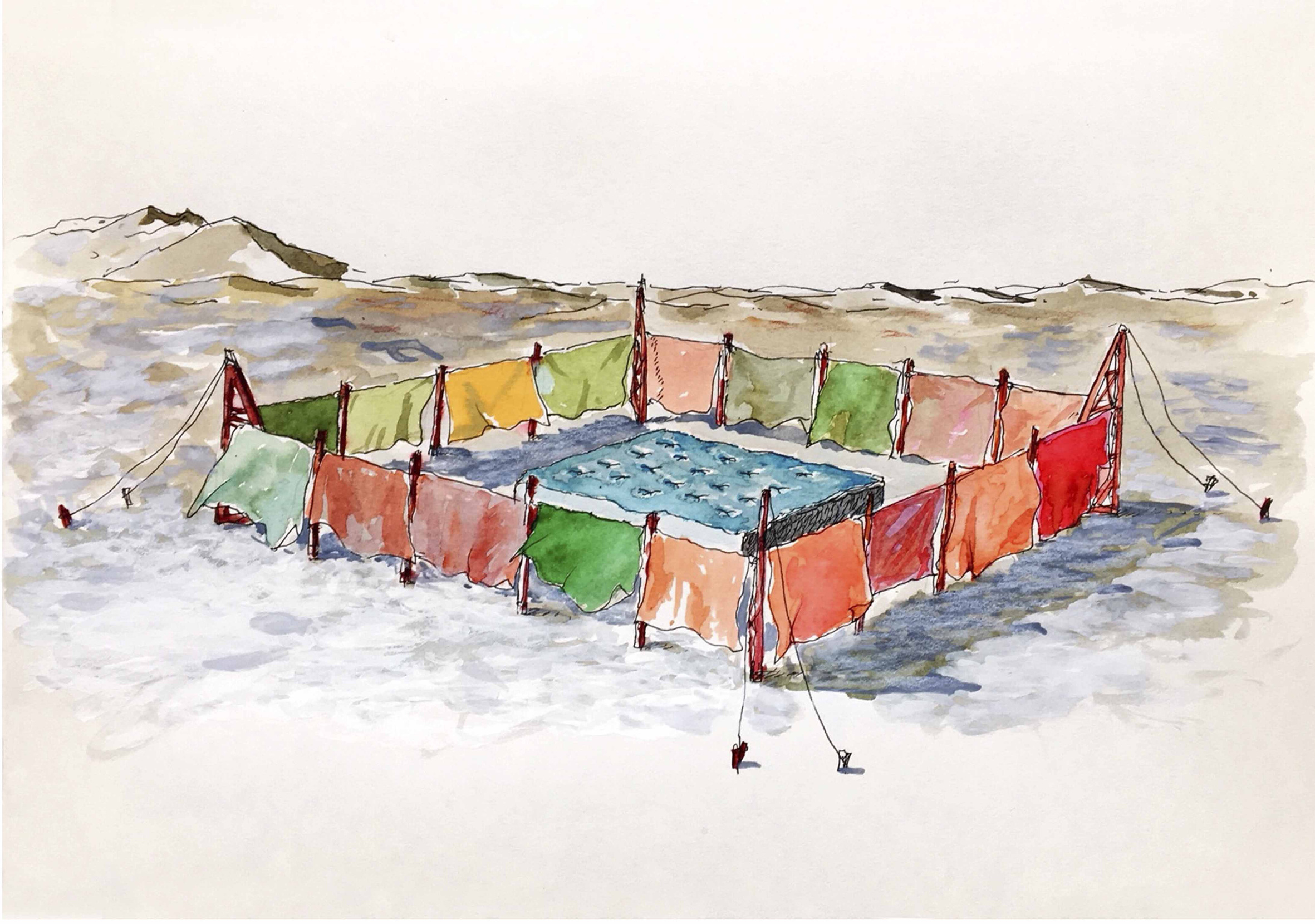In direzione analoga sono orientati i disegni di Franco Raggi, pensati come risposta alle figure cadenti di Lucia Lamacchia; paesaggi immaginari dal titolo “Luoghi organizzati per cadute improbabili” che danno vita ad ambienti adatti alle cadute, predisposti ad attutire il colpo, a salvare, coloro che precipitano. L’artista inserisce in scenari naturali e desolati, scarsi di vegetazione, delle costruzioni arcaiche e irreali, tralicci, muri, stanze senza soffitti, zattere, strutture labirintiche, con al loro interno teli, cuscini, tappeti erbosi, parti morbide per alleviare l’impatto al suolo. In questi lavori ad inchiostro nero e acquerello emerge la vena ironica e paradossale legata alla poetica di Franco Raggi che, nei suoi disegni, allestimenti, scenografie e oggetti, spesso si sofferma su collegamenti tra concetti opposti come “Stabile/Instabile”, “Mobile/Immobile”, “Antico/Moderno”. Un dualismo che si intuisce anche nella lampada “La Classica” progettata nel 1975, prodotta oggi dall’artista in serie limitata ed esposta al centro della Galleria.